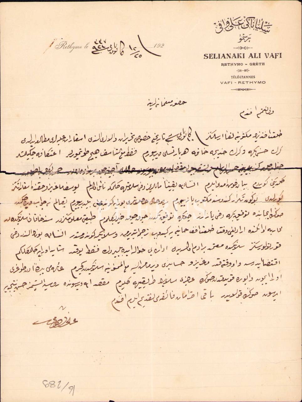 Osmanlıca Selianaki Ali Vafi-Resmo antetli kâğıtta şahsi mektup, 1337 tarihli, 20x27 cm, ortadan yırtık ve tamirli haliyle