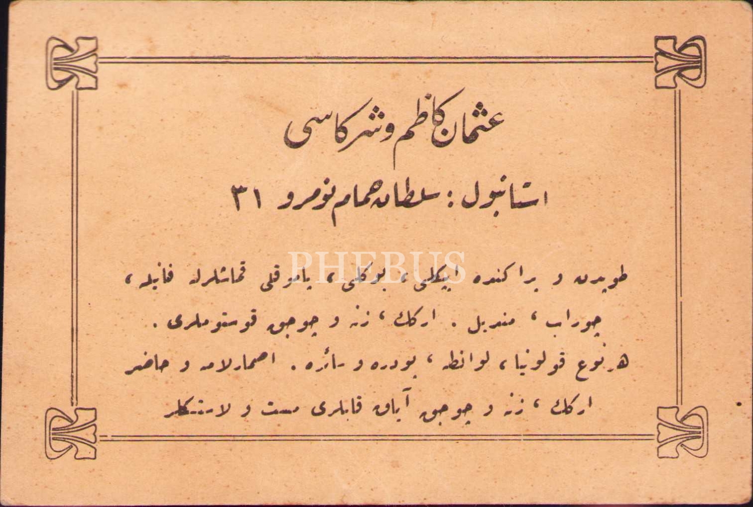Osmanlıca Osman Kâzım ve Şürekası reklam kartı, İstanbul, arkası Osmanlıca yazılı, 9x13 cm
