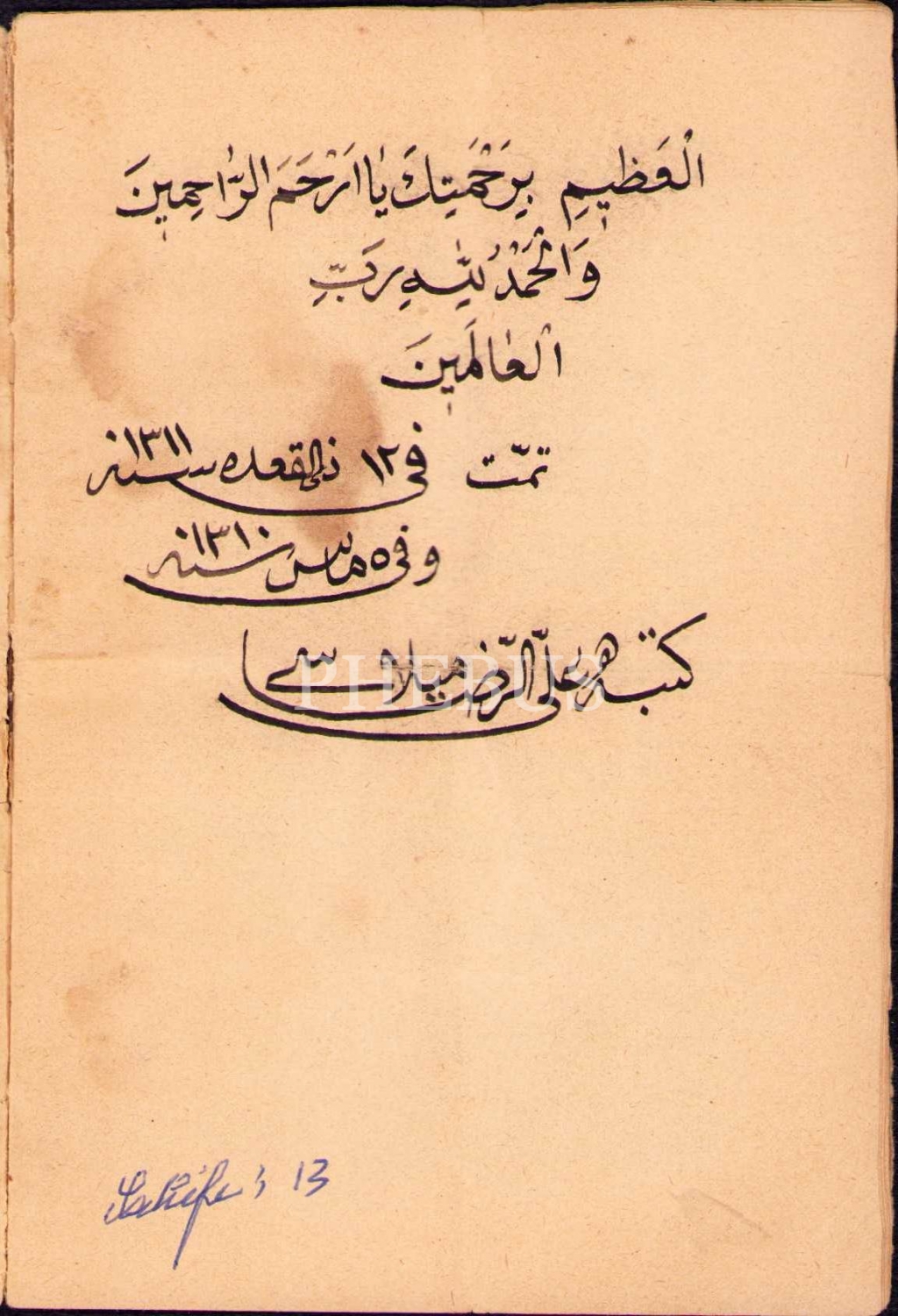 El Yazması Dua Risâlesi, Ali Rızâ Milâsî ketebeli, 1311 târihli, 7 varak, hâliyle, 10x14 cm