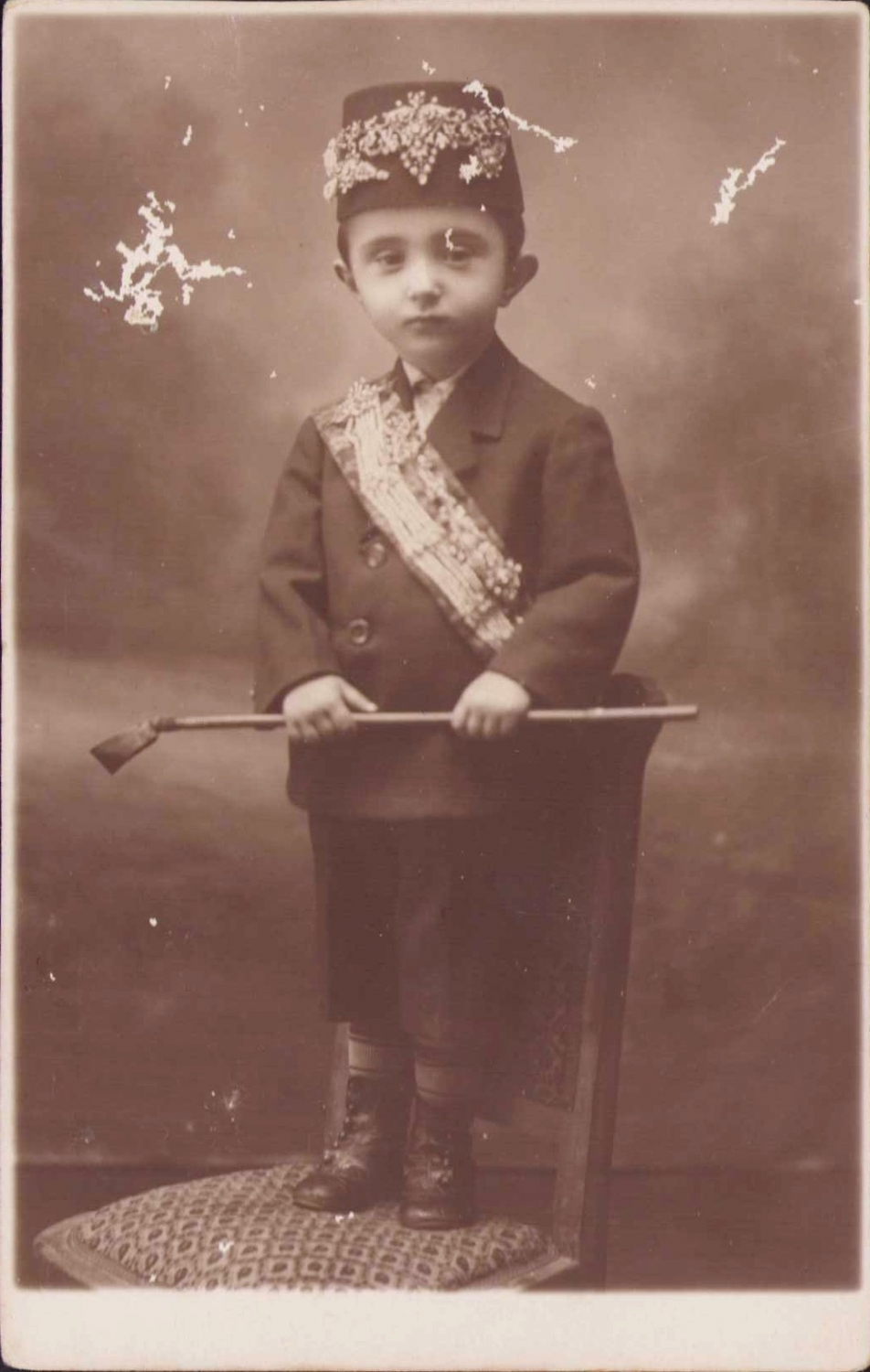 Osmanlı dönemi fesli sünnet çocuğu, elinde kamçısıyla, 9x14cm