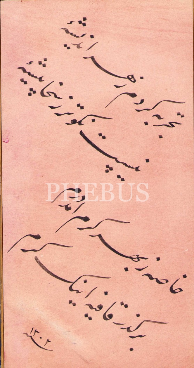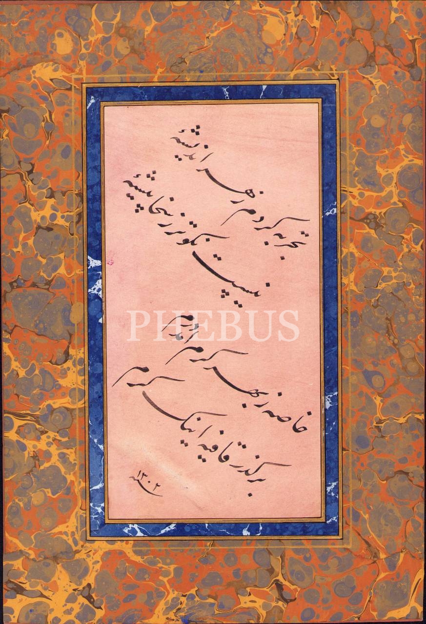 Farsça Mâil Kıta, "Tecrübe kerdem zehr-i endîşe/Nist nikûter zi sehâ-pîşe/Hâsse zi beher kerem âmed derem/Ber güzer kâfiye înek kerem", 1302 târihli, ebrulu, arka kısmında Hattat Mehmed Elif Efendi'ye ait olduğuna dair not mevcut,sadece yazı 12x23 cm