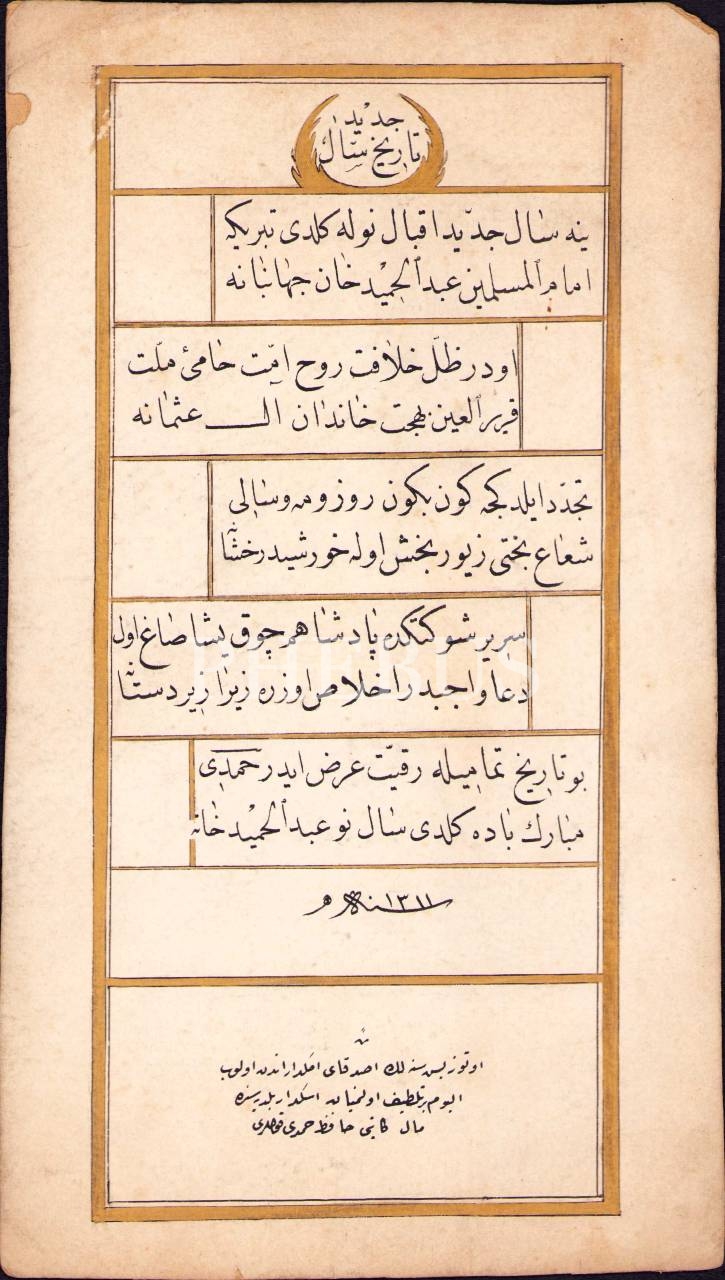Sultan İkinci Abdülhamid Han İçin Yazılıp Târih Düşürülmüş Yeni Yıl Şiiri, "Târih-i Sâl-i Cedid", Üsküdar Belediyesinde Mal Kâtibi Hâfız Hamdi Ketebeli, 1311 târihli, 17x31 cm