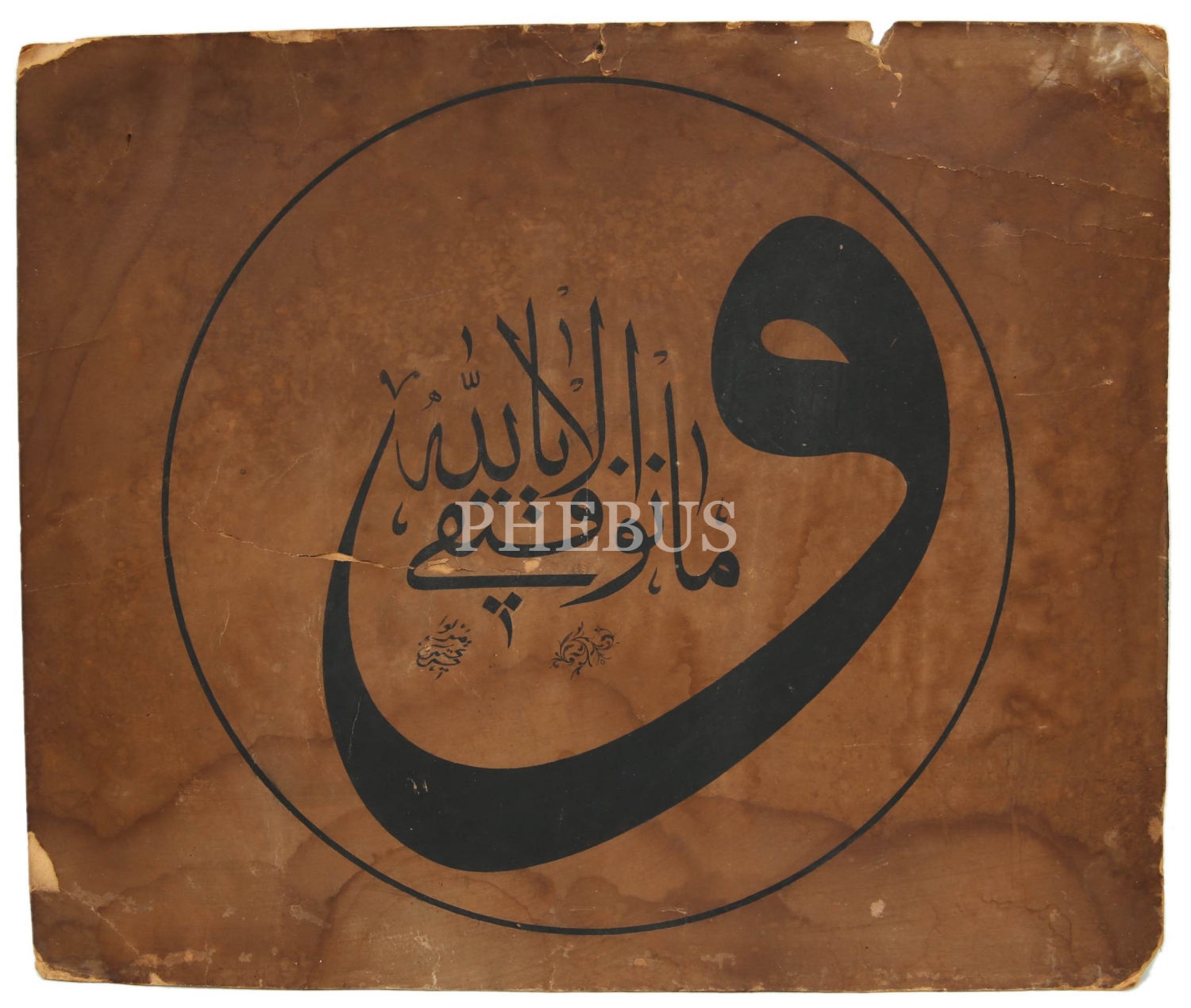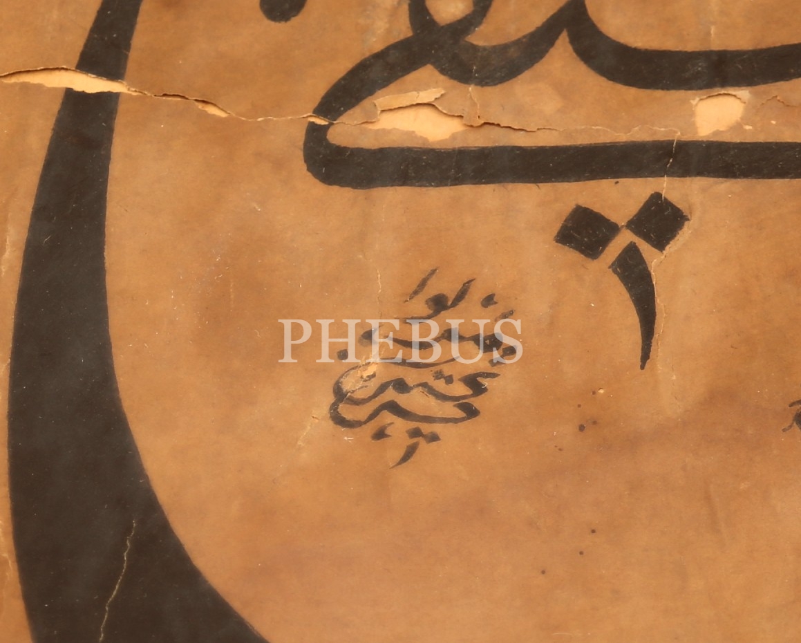 Mirliva Hasan Tahsin ketebeli Celi Sülüs İstif, bir kenarı kırık ve orta kısımda dökülmeler mevcut, 40x32 cm