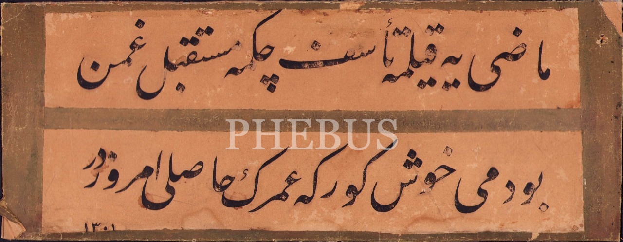 Farsça Talik Levha, "Mâzîye Kılma Teessüf Çekme Müstakbel Gamın/Bu demi hoş gör ki ömrün hâsılı imruzdur", 1301 târihli, 35x14 cm