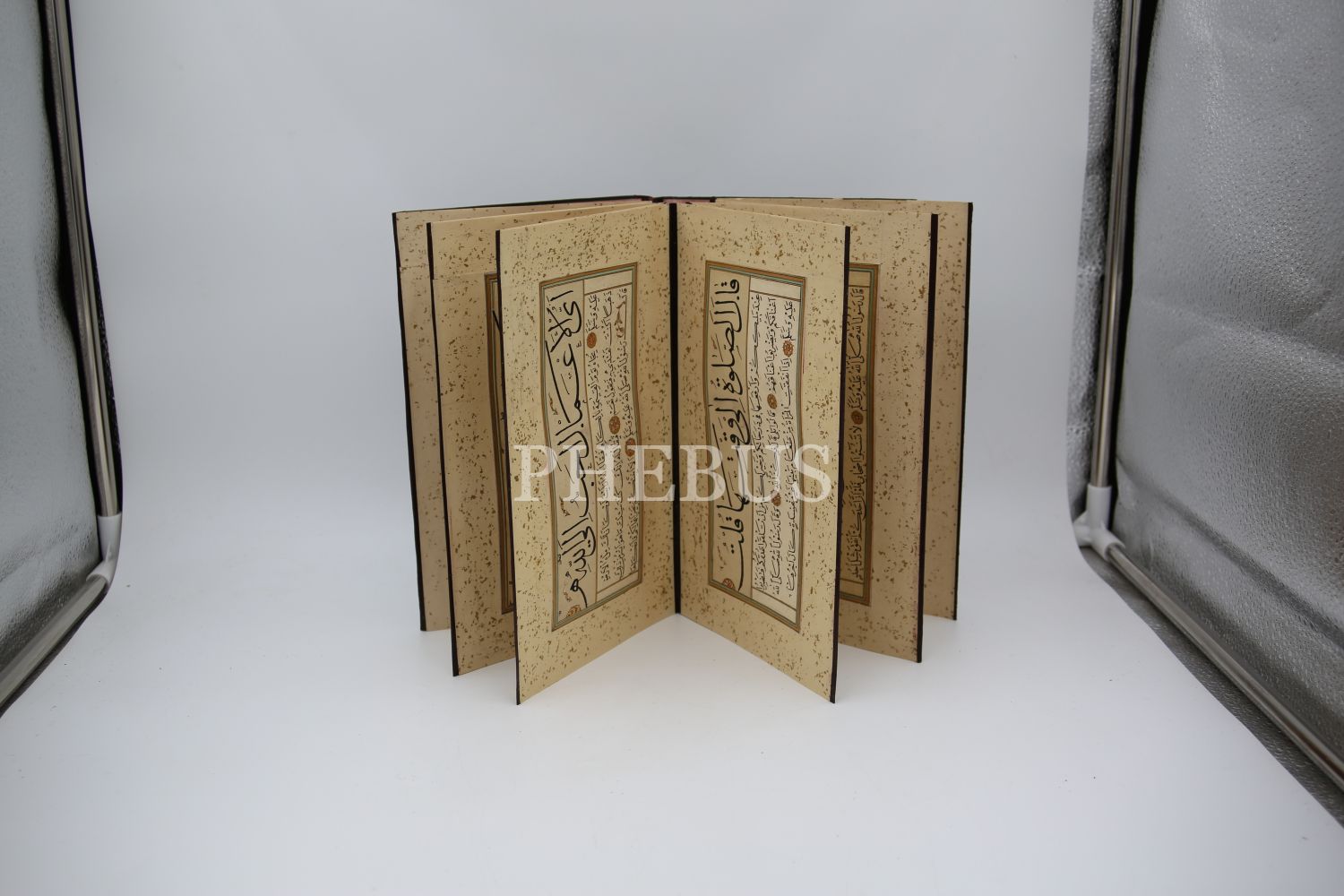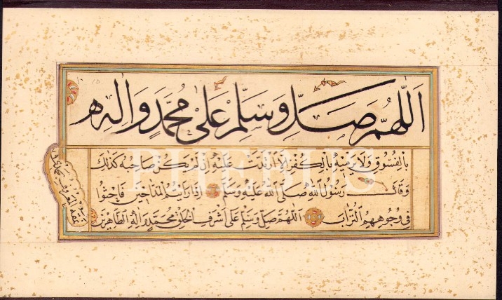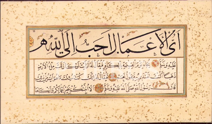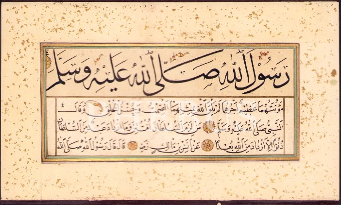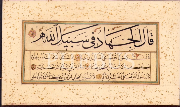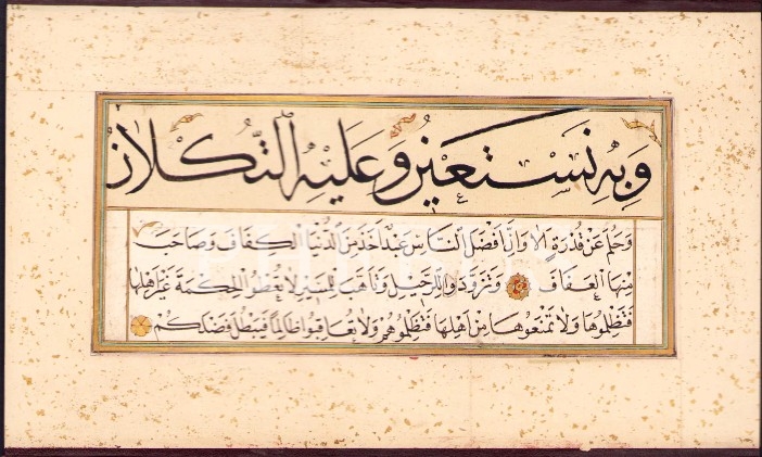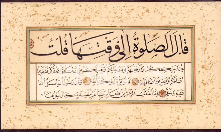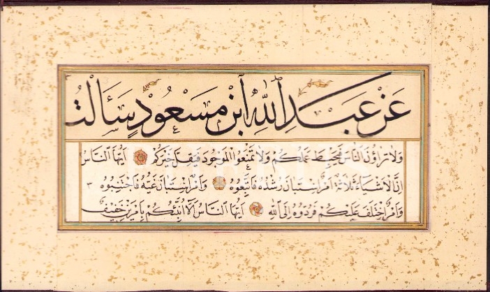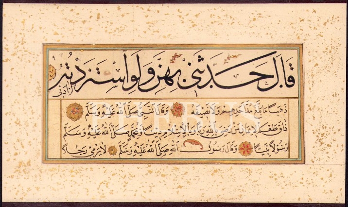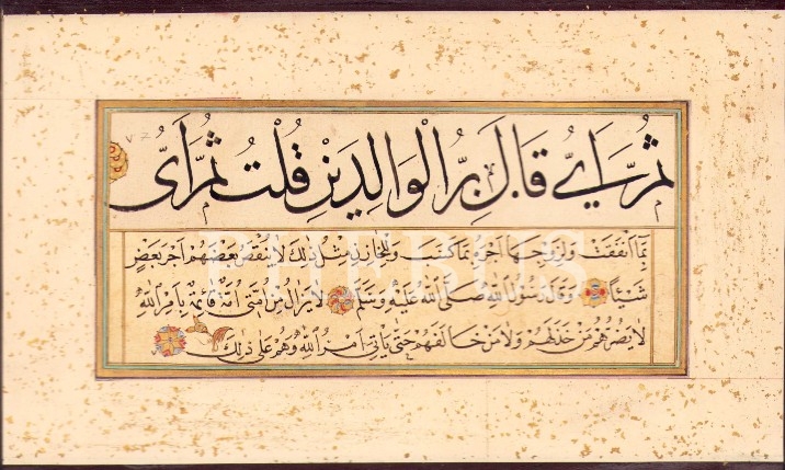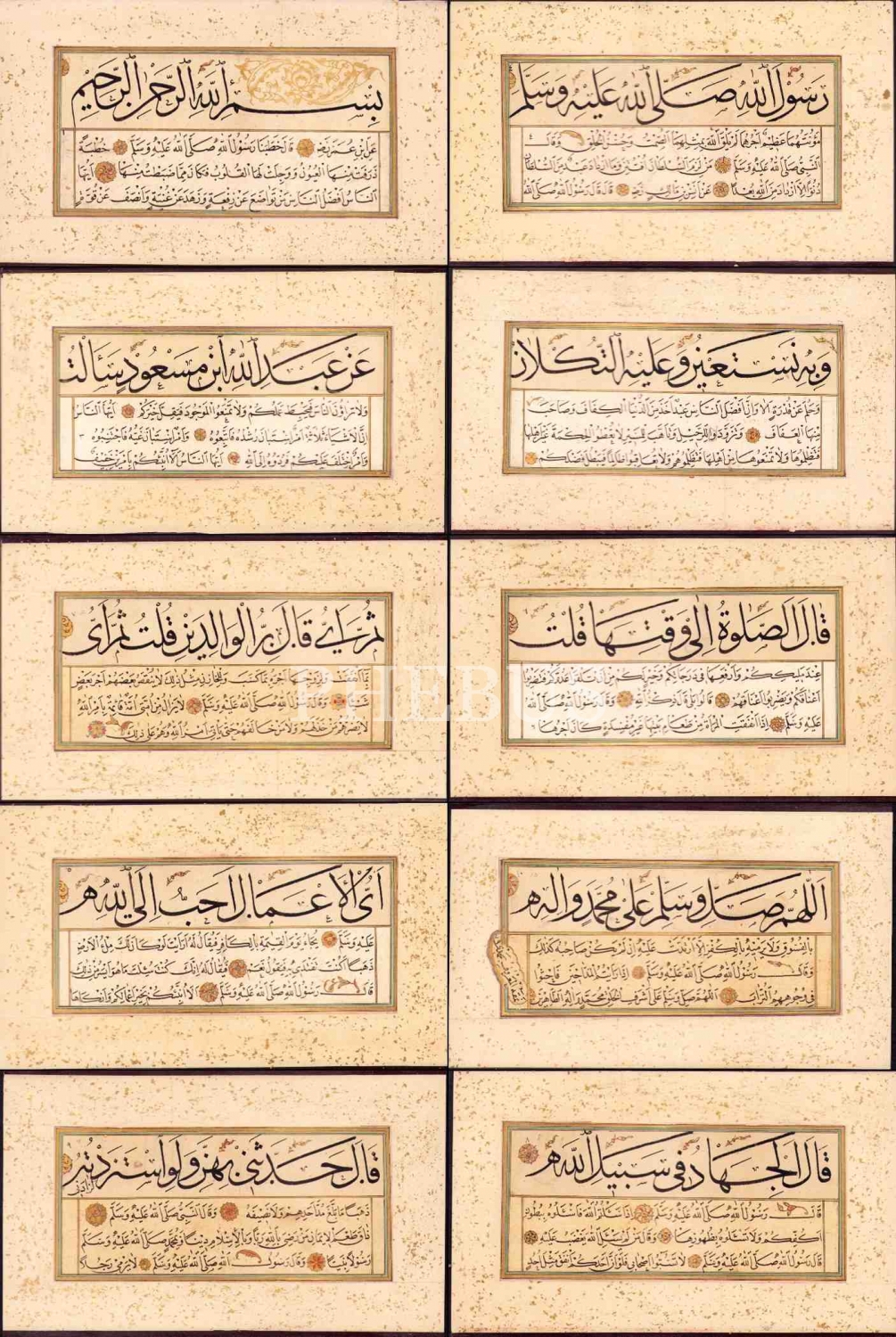 Meşhur Hattat Karalamacı Seyyid Hamdi Efendi'nin Sülüs Nesih Hadis-i Şerif Kıta Murakkaı, birleşik hâlde 10 parçadan müteşekkil, yeşil deri cildinde, her biri 17x8 cm, cild 23x14 cm