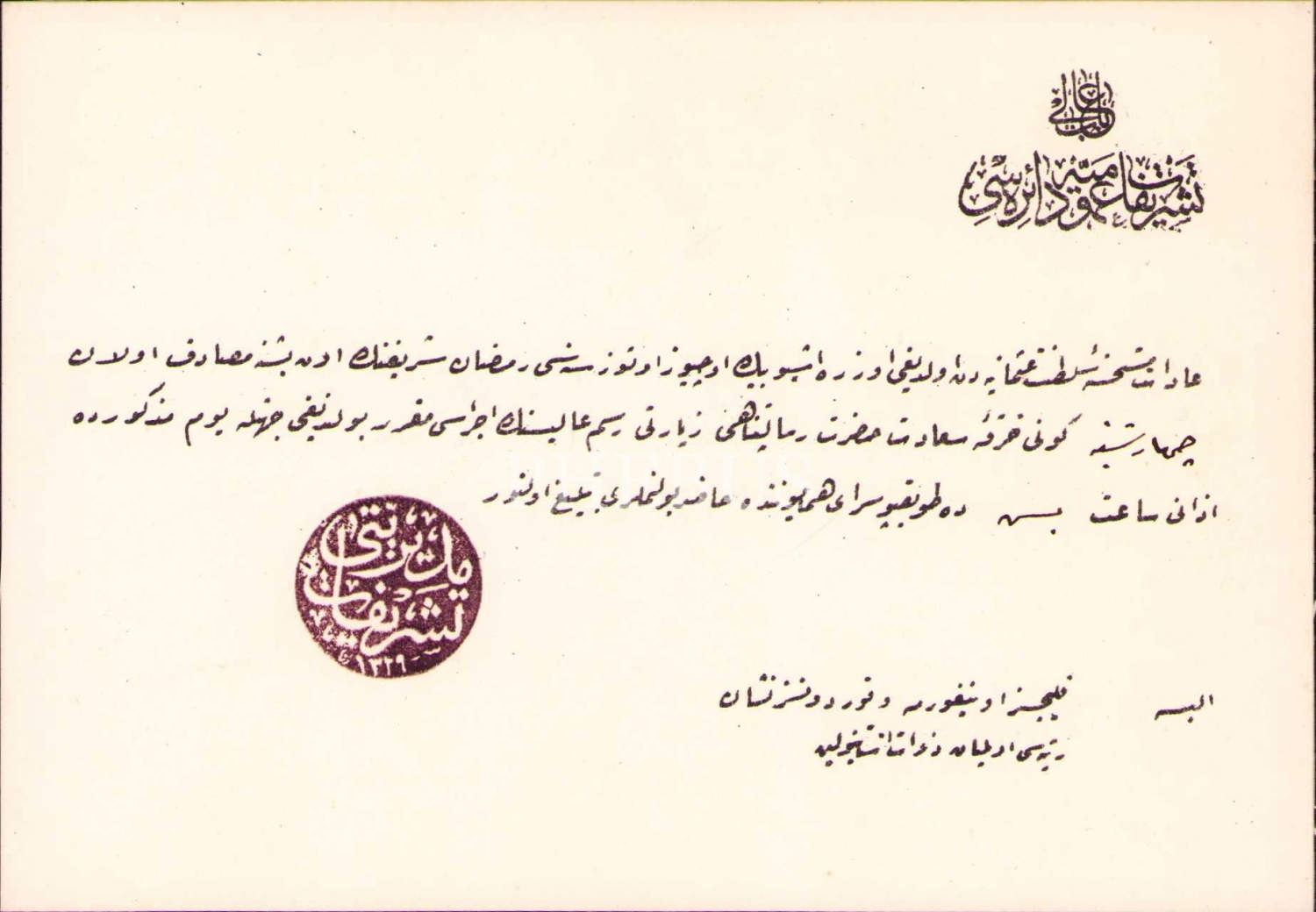 Osmanlı Dönemi Hırka-i Saadet Destmâl-i Şerif Merâsimi Davetiyesi, Ramazan 1330 târihli, Osmanlıca, Teşrifat-ı Umumiye Dâiresi antetli, 16x11 cm