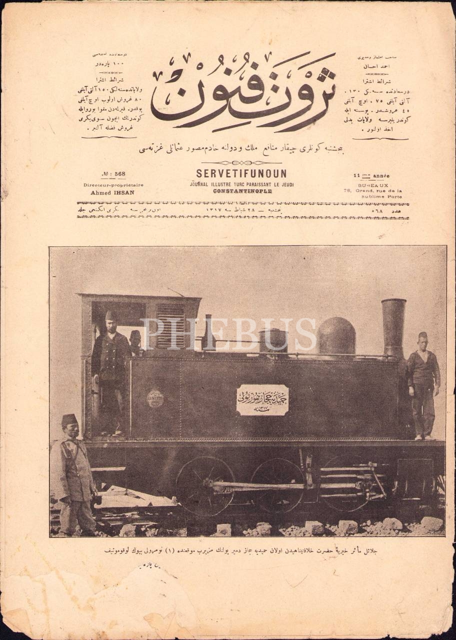"Hamidiye Hicaz Demiryolu Lokomotifi" Kapaklı Osmanlıca Servet-i Fünun Dergisi, Sahibi: Ahmed İhsan, 28 Şubat 1317 târihli, 8 sayfa, kapak sayfasının sol alt köşesi kopuk hâliyle, 26x35 cm