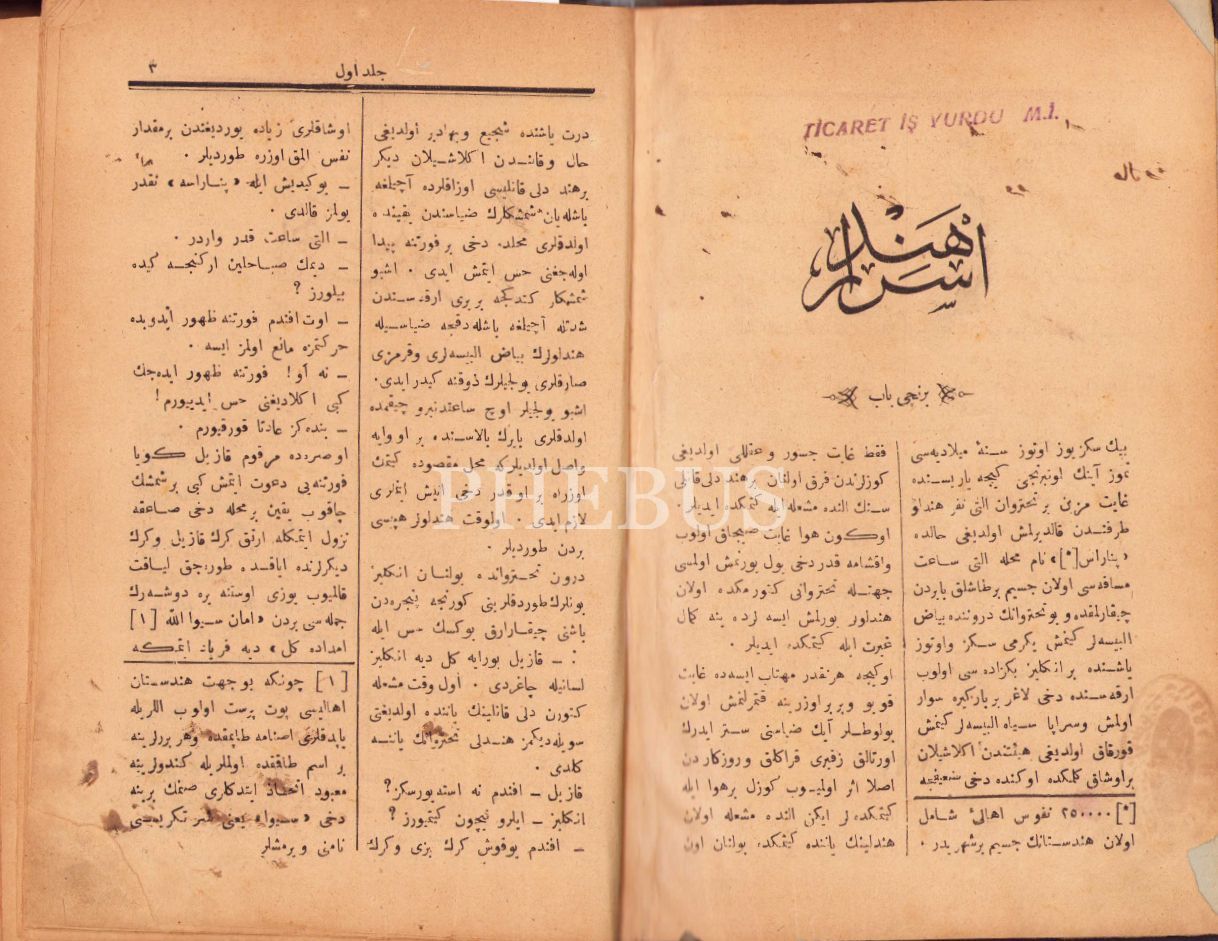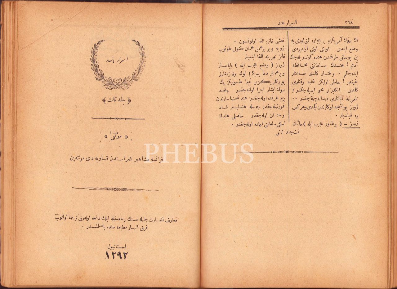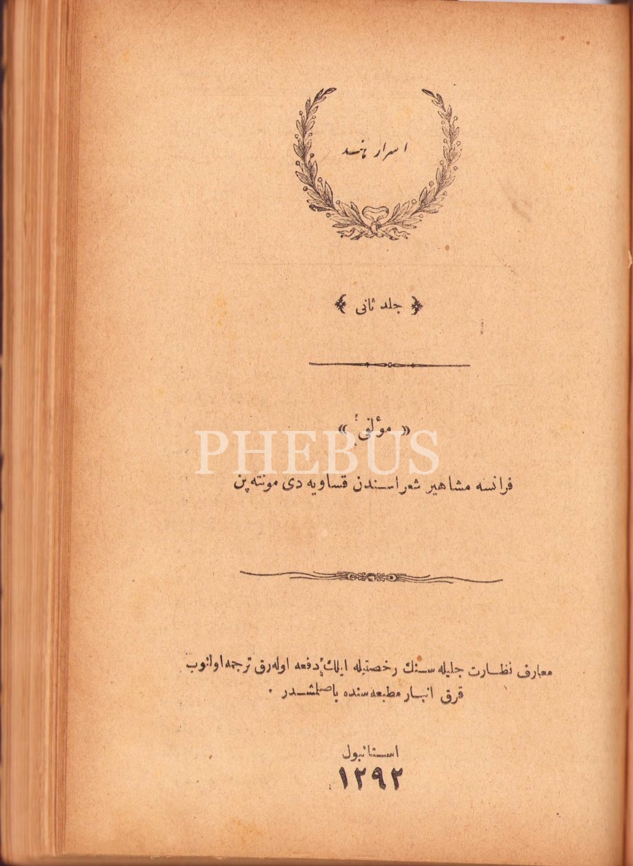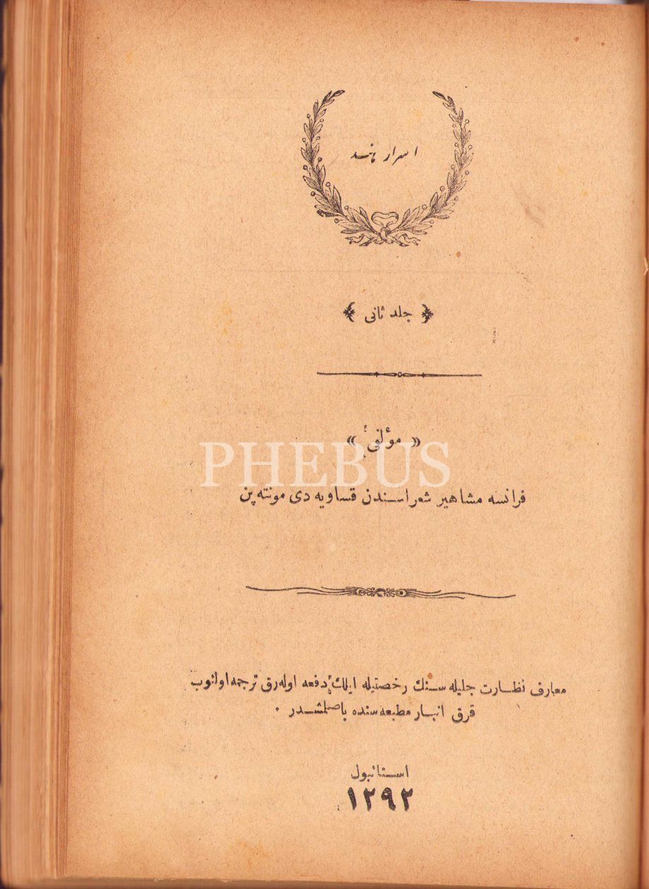 Osmanlıca Esrâr-ı Hind [3 cilt], Xavier de Montepen, Kırk Anbar Matbaası, 346 s., İstanbul 1291, 16x24 cm, bazı sayfaları yırtık haliyle, ÖZEGE No: 5168