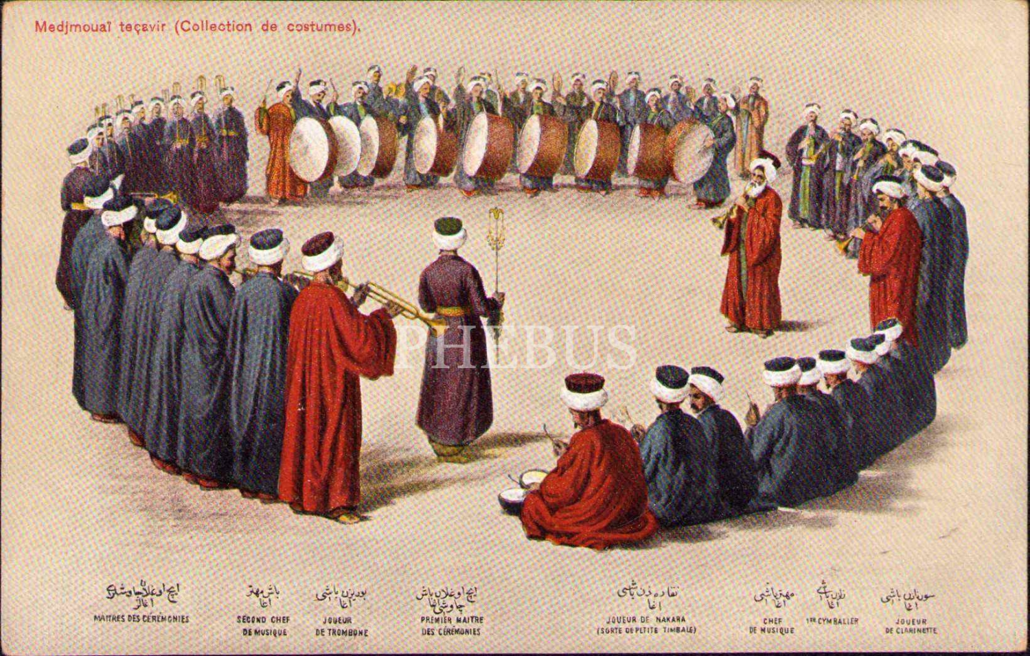 Kostüm kartpostalı: Mehterbaşı Ağa, İçoğlan Baş Çavuşu Ağa, Boruzenbaşı Ağa, Nakkarezenbaşı Ağa, ed. Max Fruchtermann, Constantinople