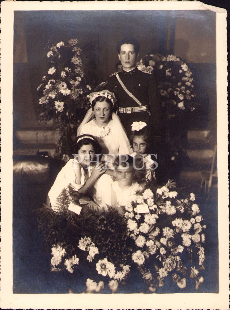 Çocuklarla düğün hatıra fotoğrafı, M. Hayrettin soğuk damgalı, 17x23 cm, köşeleri kırık haliyle