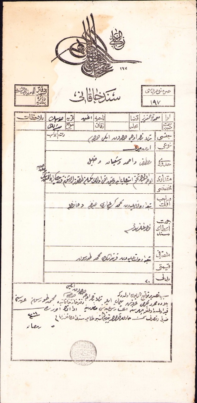 Osmanlıca Sened-i Hâkânî antetli arz-ı mîrî tarla tapusu, Elaziz [Elazığ] 1306 tarihli, 18x37 cm, üst kenarı yırtık ve su görmüş haliyle