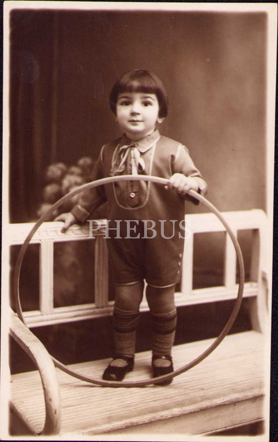 Çemberle poz vermiş oyuncaklı kız çocuğu fotoğrafı, arkası Osmanlıca ithaflı ve 1929 tarihli