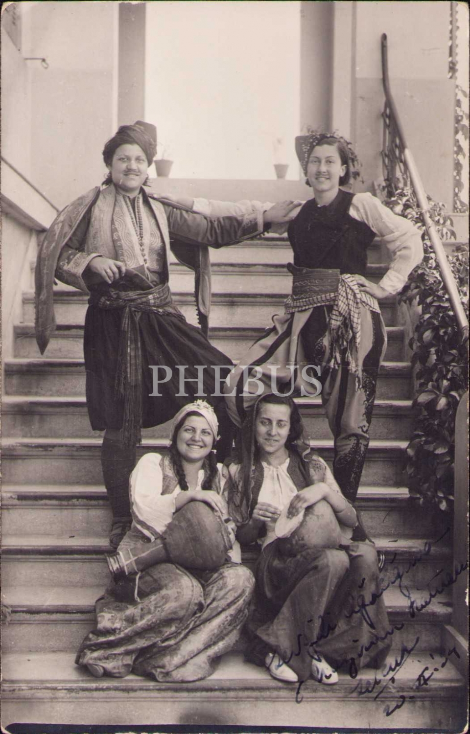Yöresel kıyafetlerle poz vermiş genç kızlar hatıra fotoğrafı, ithaflı ve 1934 tarihli