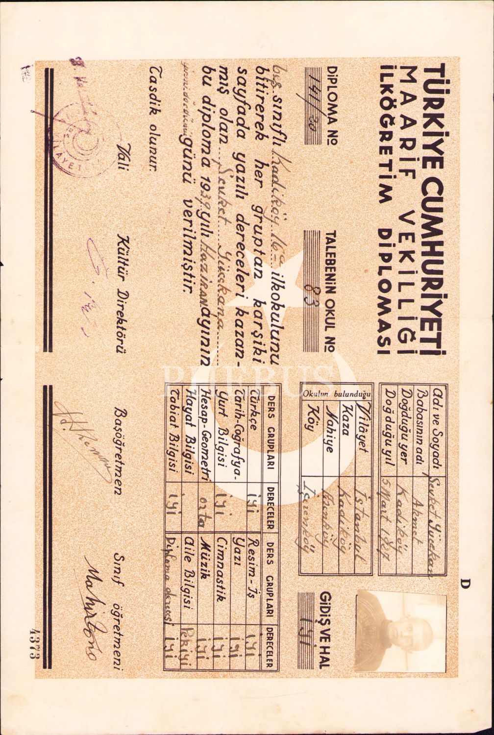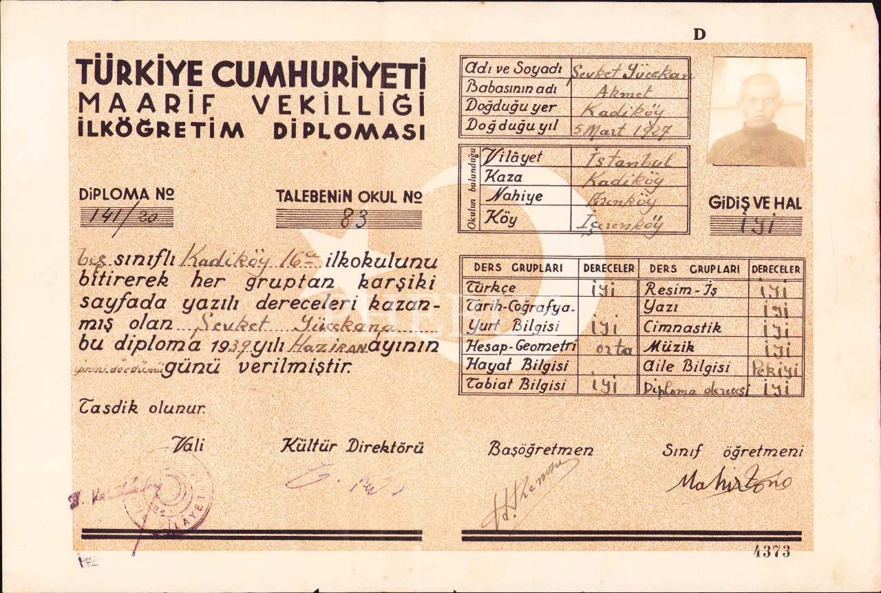 Fotoğraflı ilköğretim diploması, Kadıköy 1939, 22x33 cm, kenarı hafif yırtık haliyle