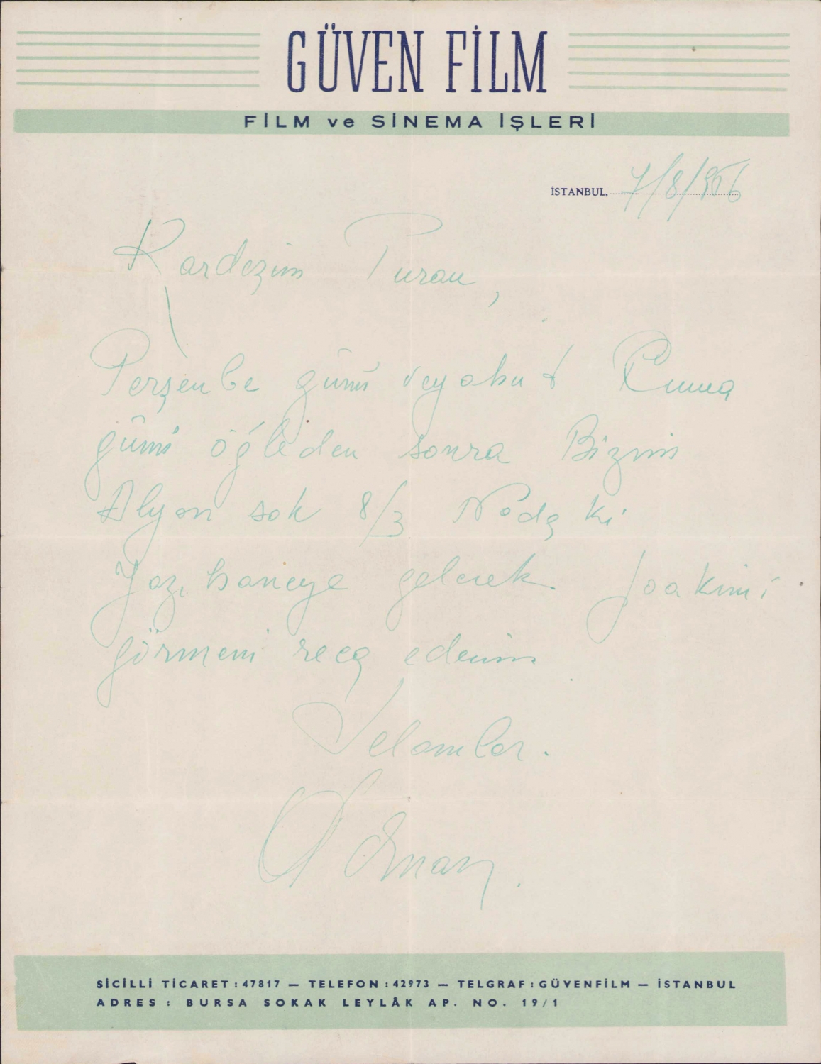 Güven Film antetli kağıtta iş yazışması, ıslak imzalı, 1966 tarihli, İstanbul adresli, 22x28cm