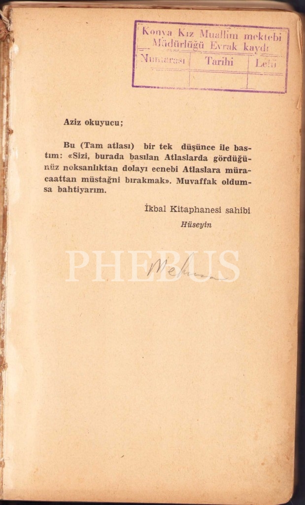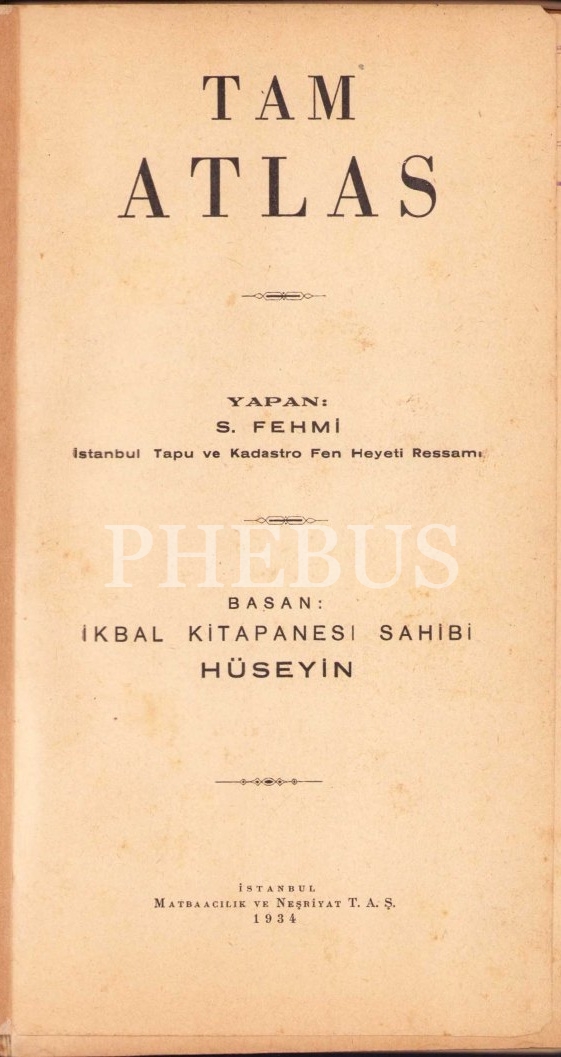 Tam Atlas, S. Fehmi, İkbal Kitaphanesi, İstanbul 1934, 67 s., 11x20 cm, sırtı ayrık ve dağılmış haliyle