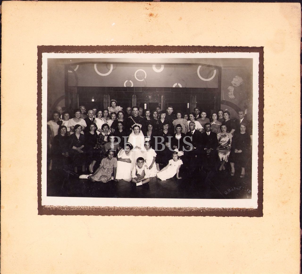 Düğünde topluluk hatıra fotoğrafı, M. Hayrettin soğuk damgalı, paspartulu, foto: 16x22 cm, paspartusu yorgun haliyle