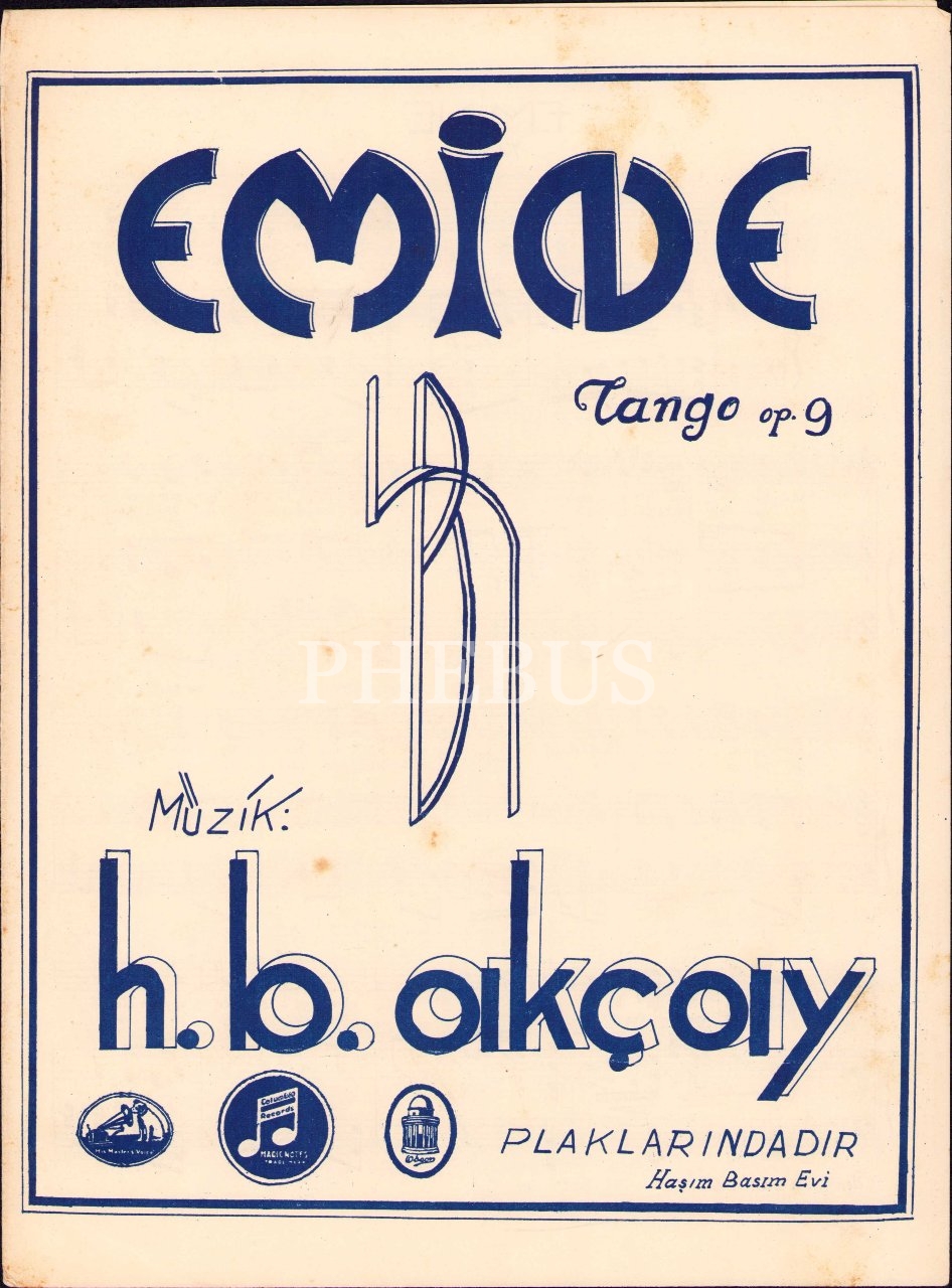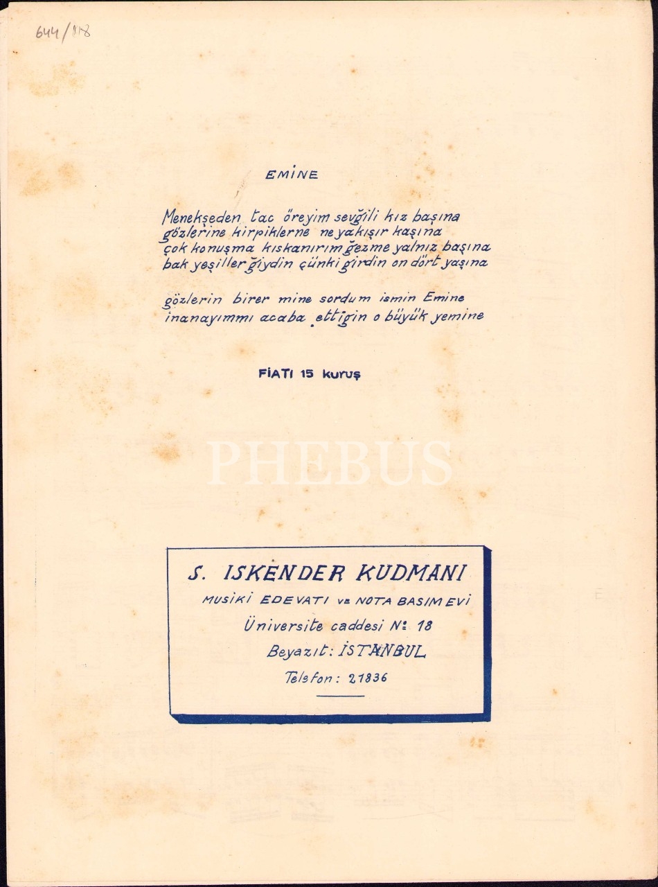S. İskender Kudmani neşriyatından "Emine" tango notası, H.B. Akçay, Rumca-Türkçe güfteli, 25x34 cm, yorgun haliyle