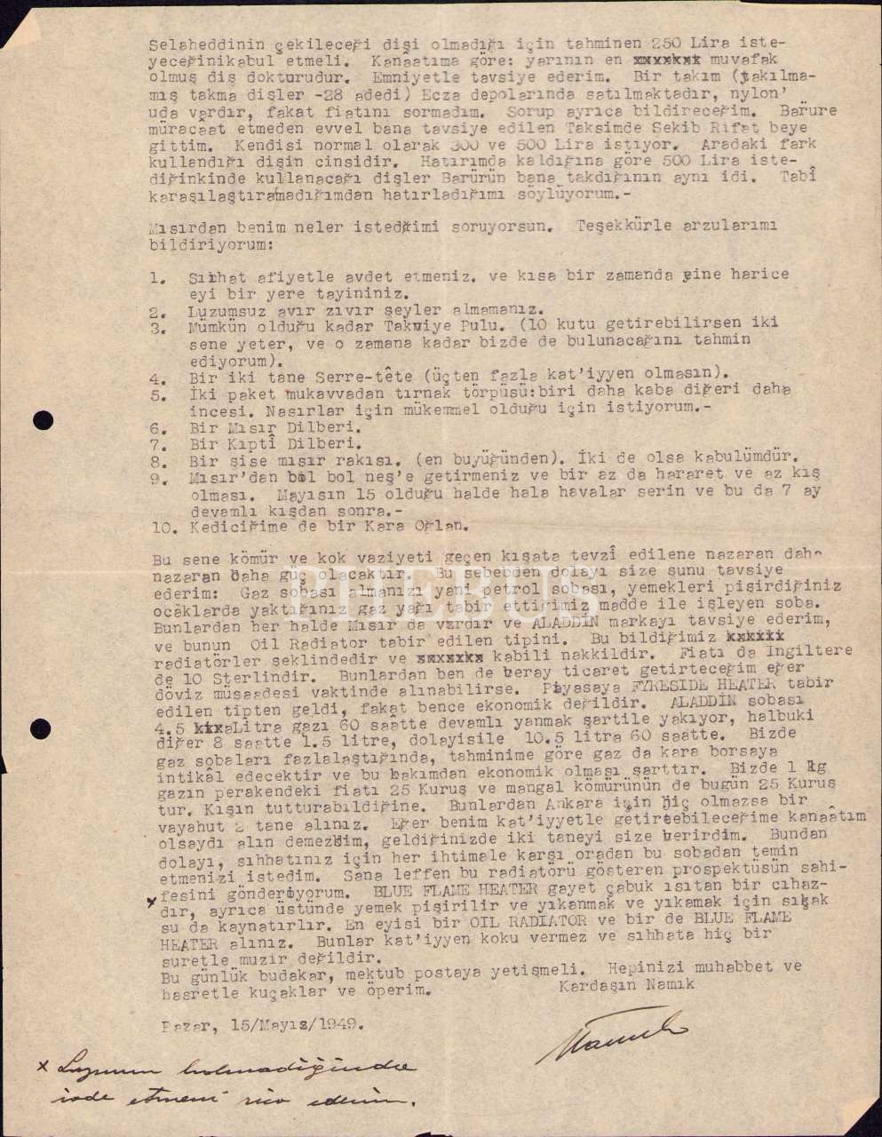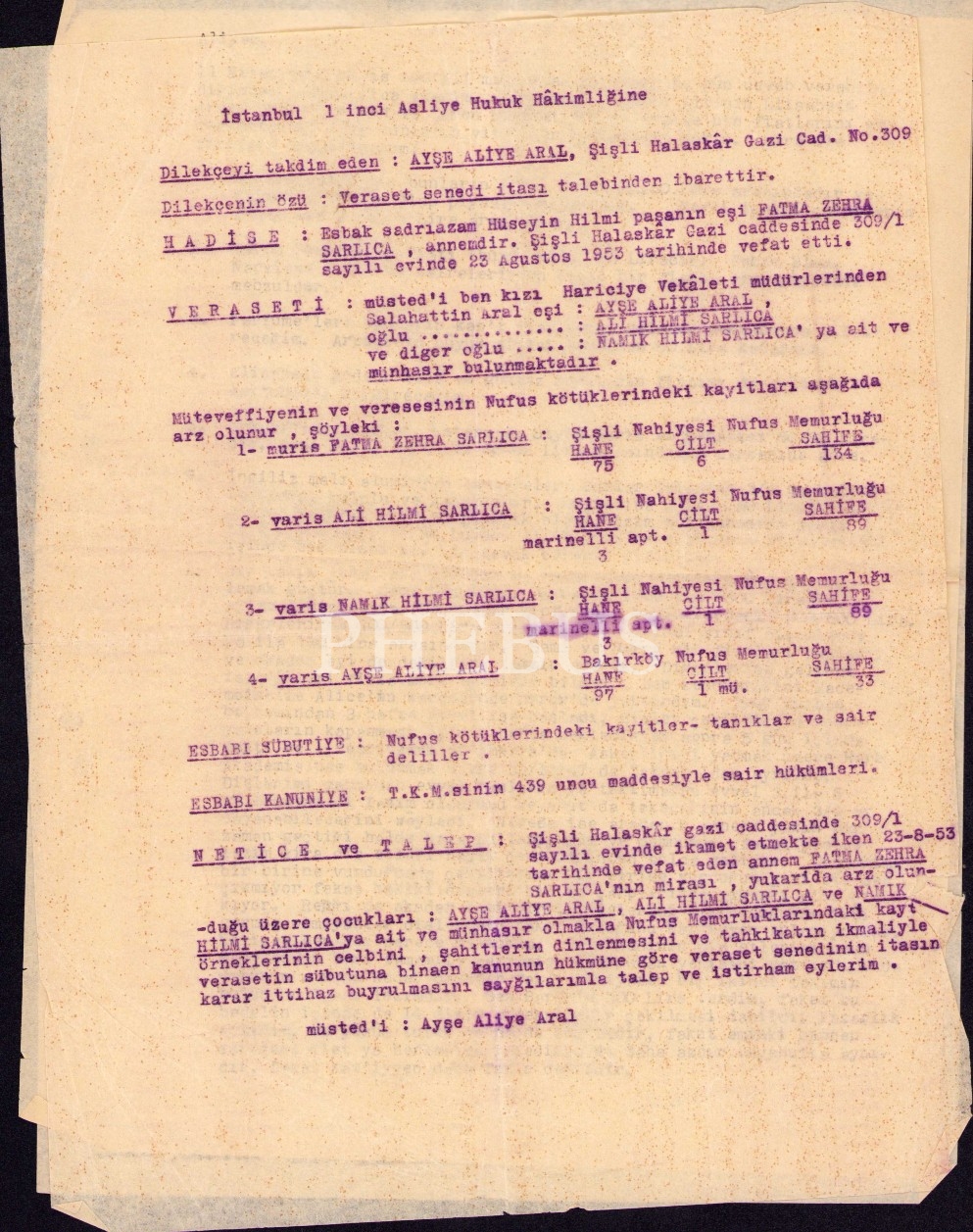 Sadrazam Hüseyin Hilmi Paşa'nın ailesine ait veraset dilekçesi ile oğlunun kardeşine 1949 tarihli mektubu, 3 sayfa, 23x29 cm, kenarları yıpranmış haliyle