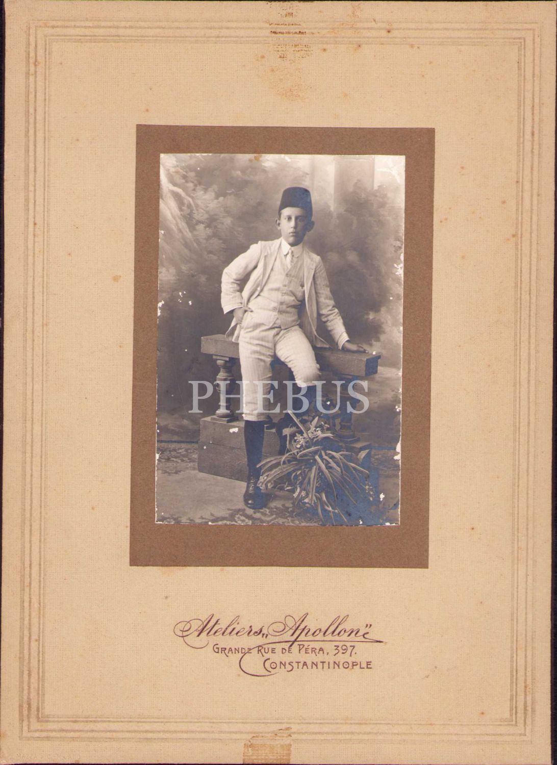Erkek çocuğu hatıra fotoğrafı, Osmanlıca ithaflı ve 1327 tarihli, Ateliers Apollone-Constantinople, kartona yapışık, foto: 6x9 cm ve kenarları soyulmuş haliyle