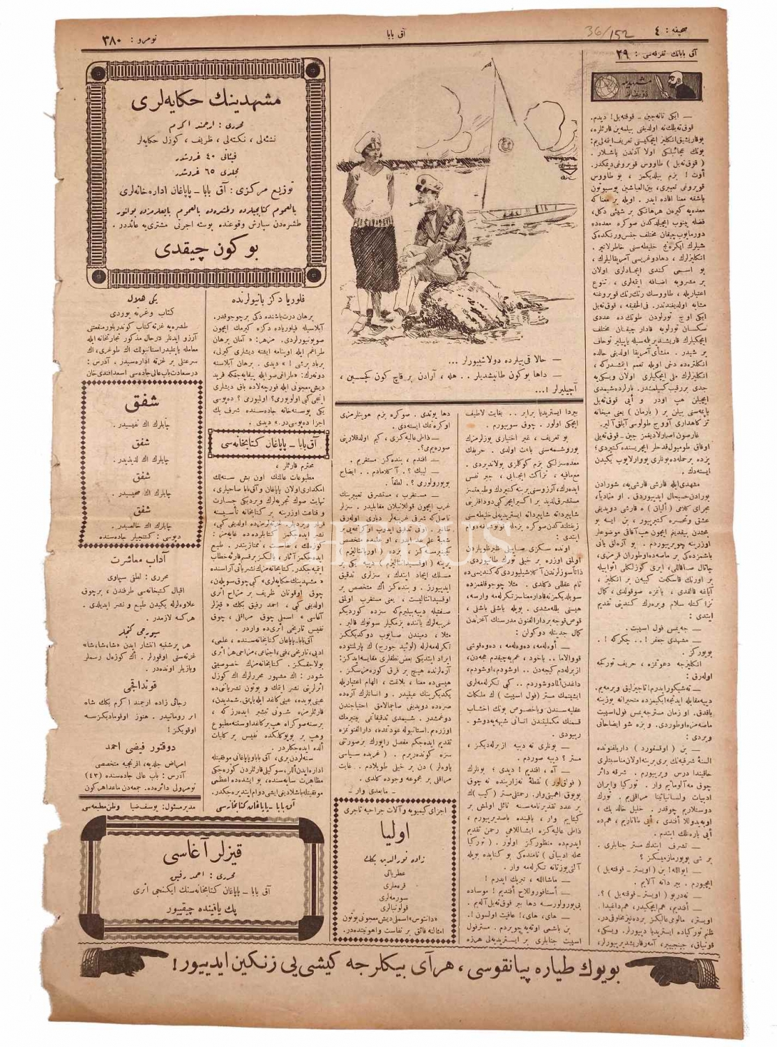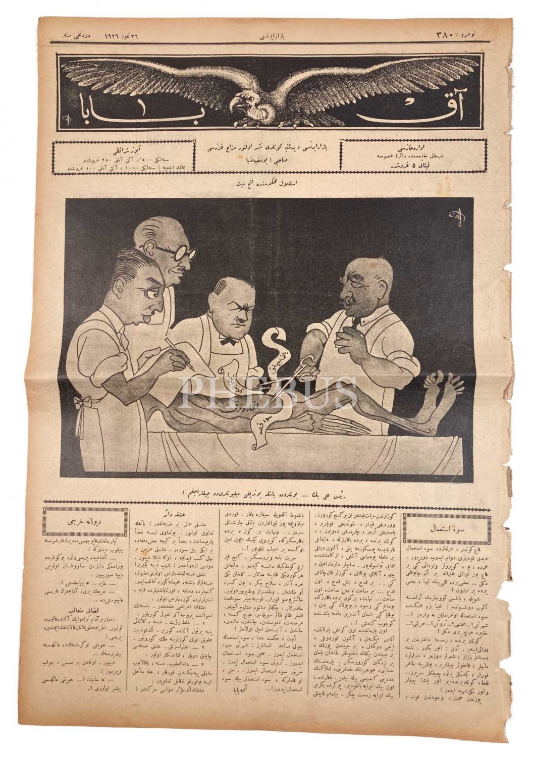 Osmanlıca Akbaba dergisi 380. sayı, 26 Temmuz 1926, 4 sayfa, 30x45 cm, bir kenarı yıpranmış haliyle