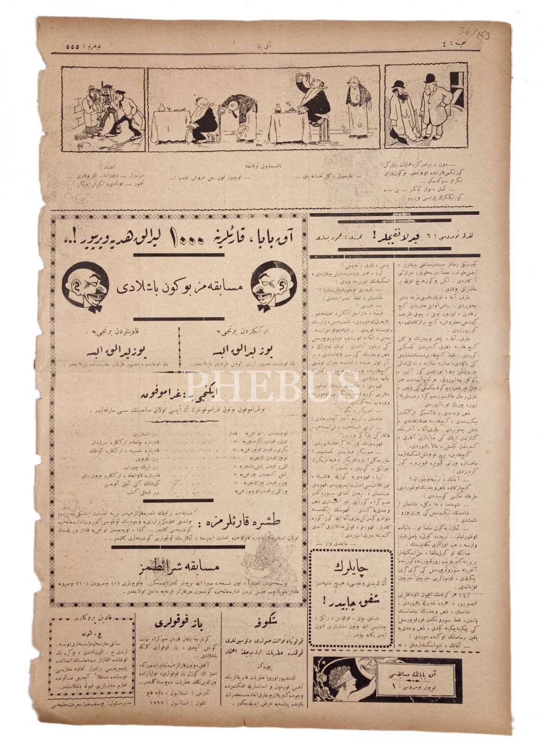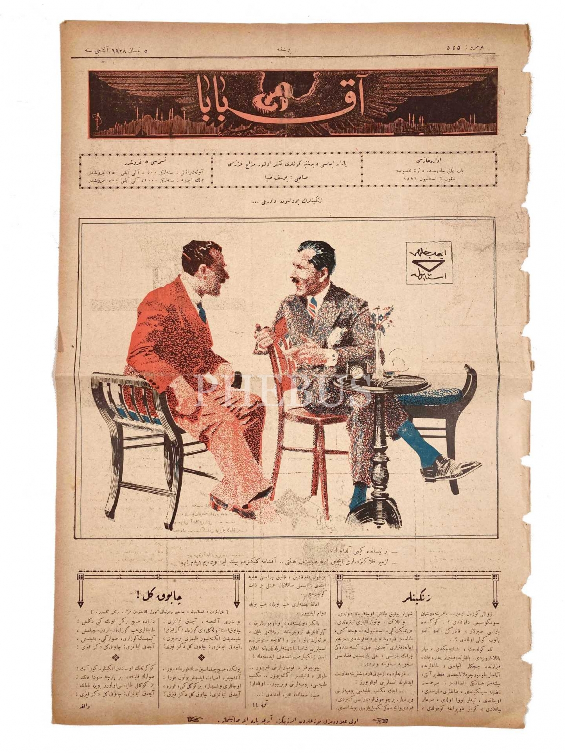 Osmanlıca Akbaba dergisi 555. sayı, 5 Nisan 1928, İhap Hulusi imzalı kapak görseliyle, 4 sayfa, 30x345 cm, bir kenarı yıpranmış haliyle