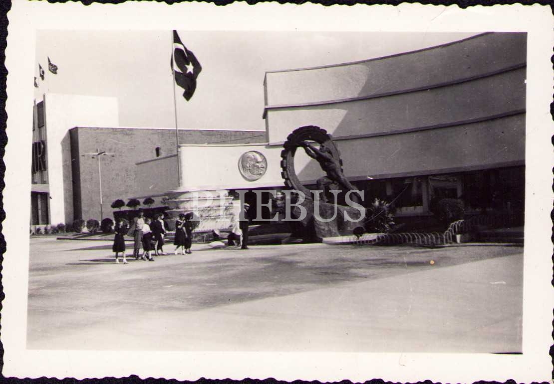 Erken dönemden kamu binası önünde Türk bayrağı, Atatürk rölyefi ve heykel fotoğrafı, 6x9 cm