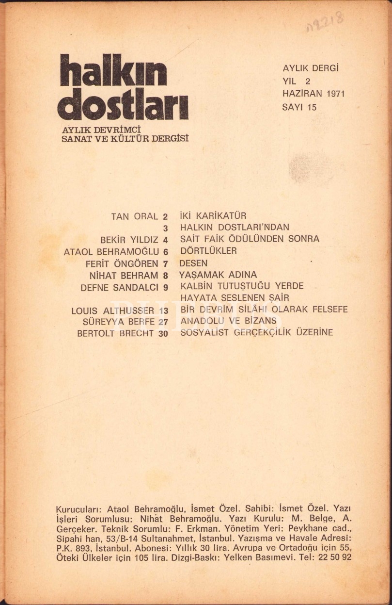1970-71 yılları arasında toplumcu gerçekçi fikirlere sahip yazar ve şairler tarafından yayımlanan devrimci derginin kadrosunda İsmet Özel, Ataol Behramoğlu, Murat Belge gibi önemli yazar ve şairler bulunmuştur.