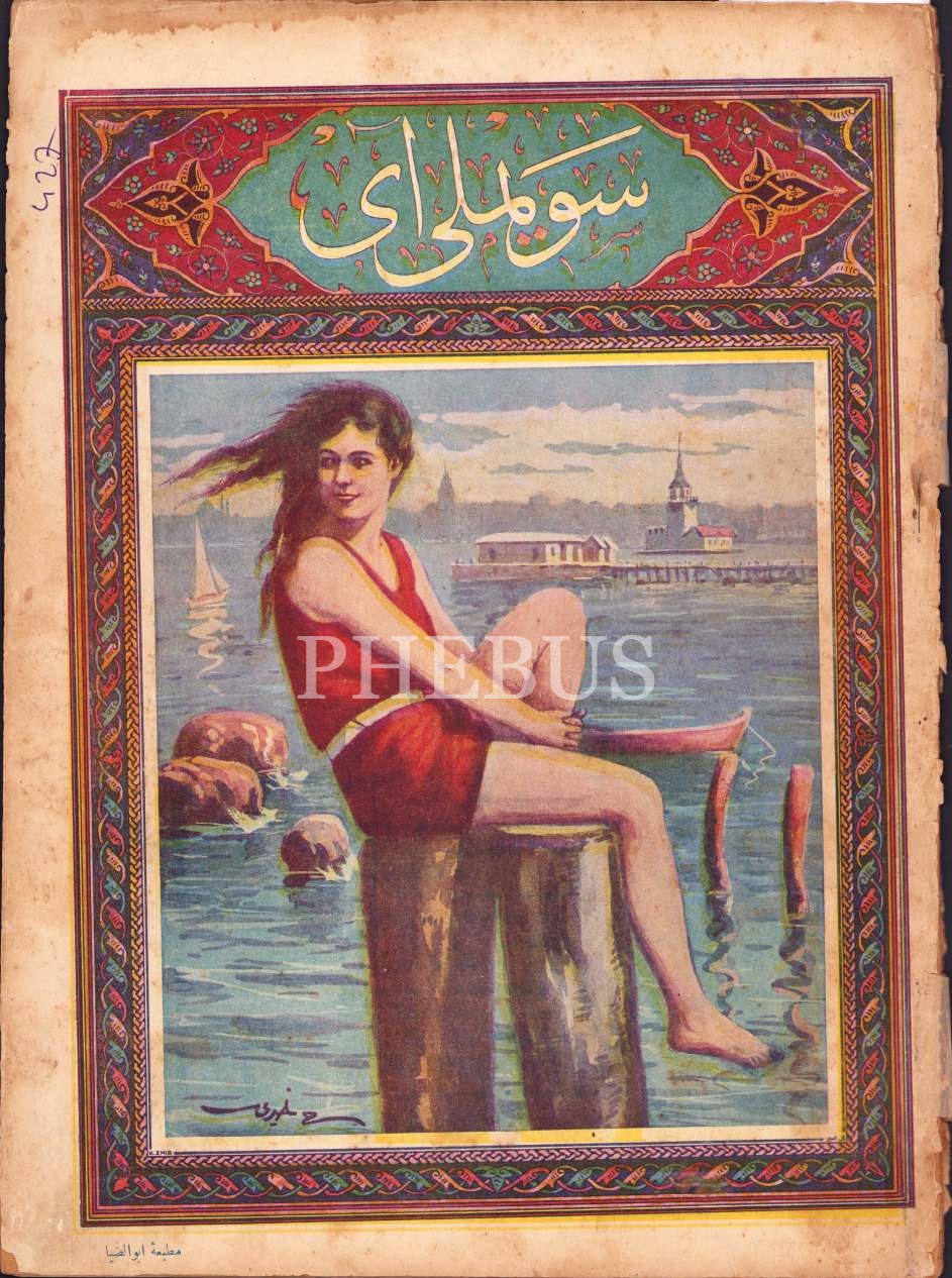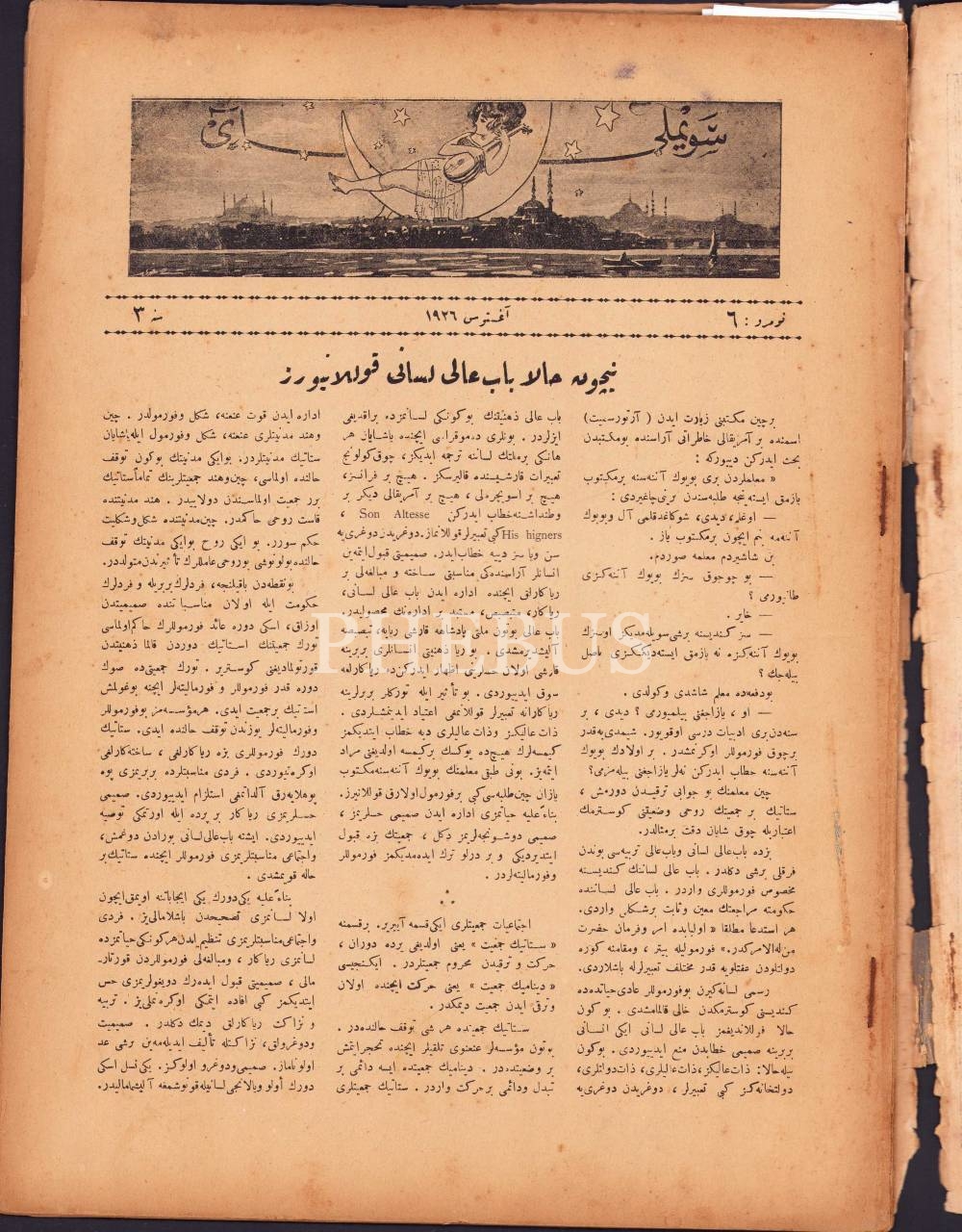 Osmanlıca Sevimli Ay dergisi 6. sayı, Ağustos 1926, Ebuzziya Matbaası, 24x33 cm, kapağı sırttan epey yıpranmış ve tamirli haliyle