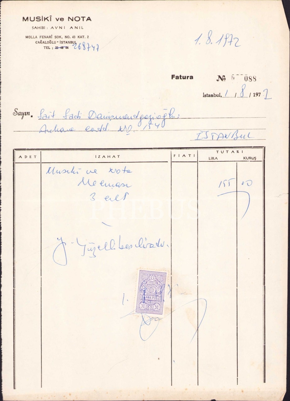 Sait Sadi Danişmendgazioğlu'na gönderilmiş Musikî ve Nota- Sahibi: Avni Anıl antetli fatura, İstanbul 1971, 20x28 cm, alt kenarı yıpranmış haliyle