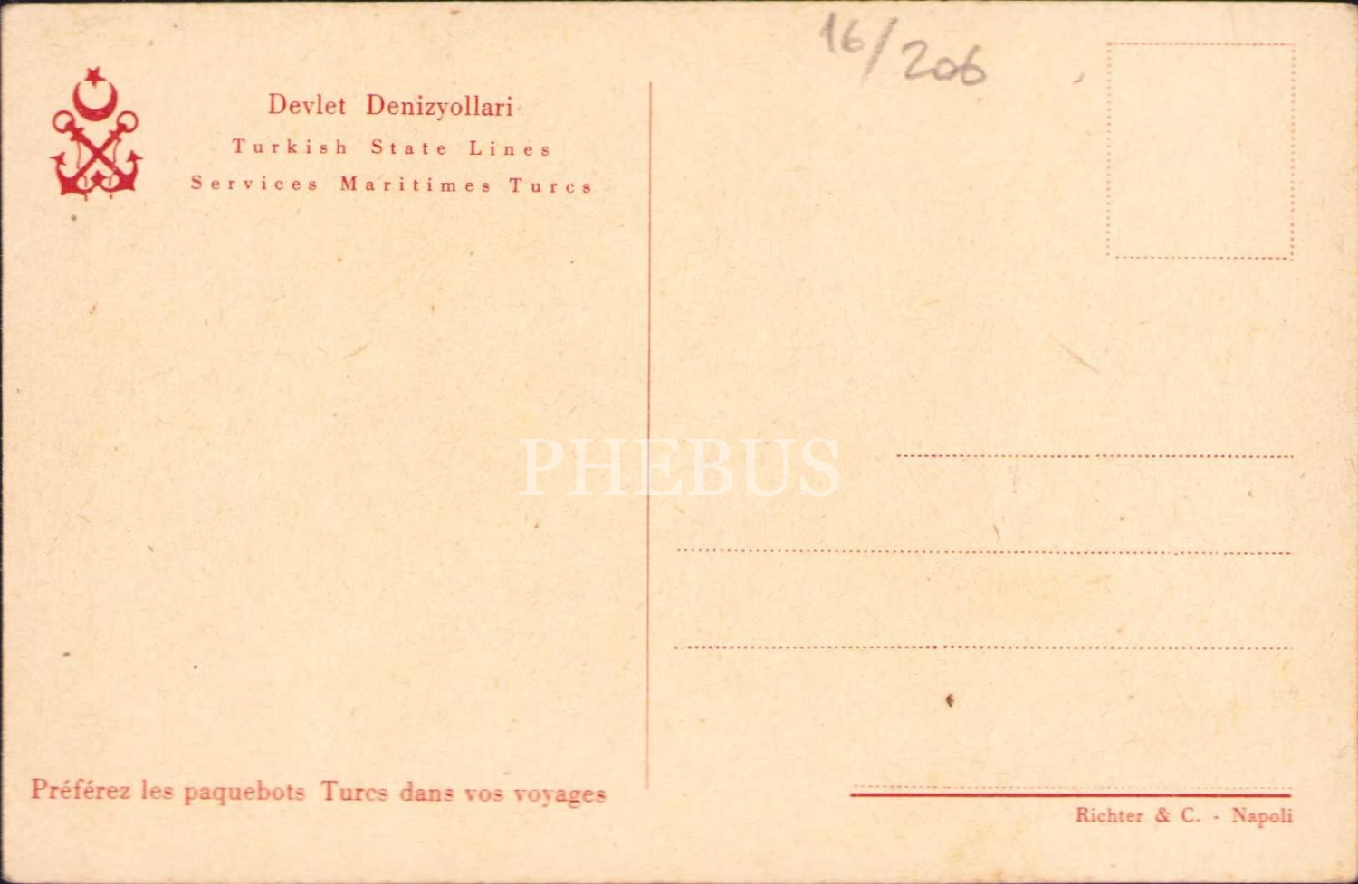 "Salih" imzalı Ankara gemisi resminin yer aldığı Devlet Denizyolları reklam kartpostalı, alt köşesi kırık haliyle