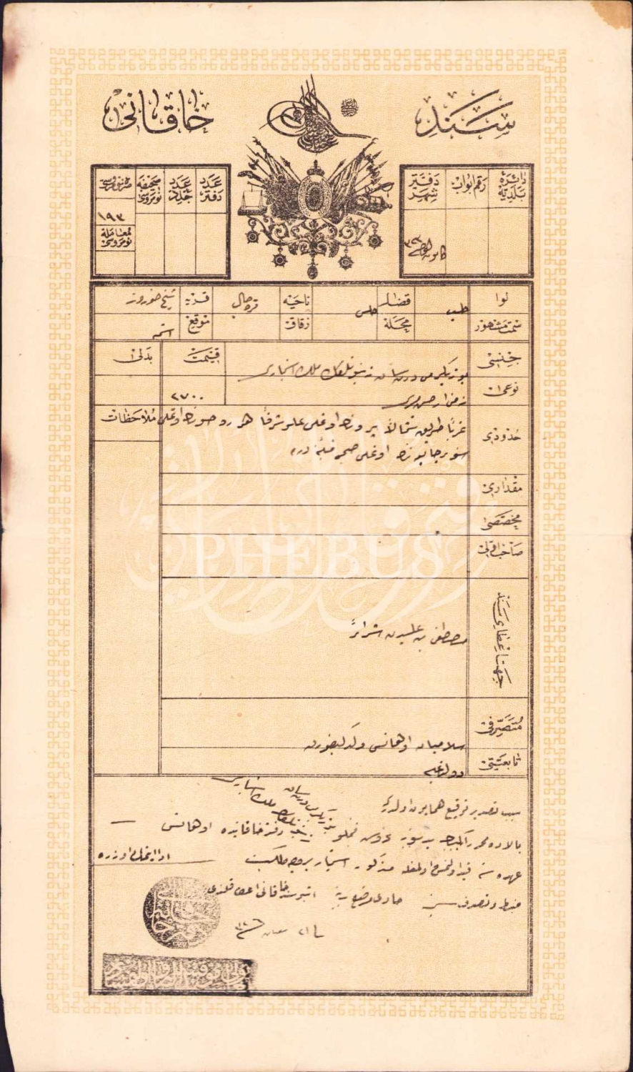 Osmanlıca Sened-i Hâkânî antetli arz-ı mîrî mülk ambarı tapusu, Kilis-Haleb 1326, 20x34 cm, köşeleri yıpranmış haliyle