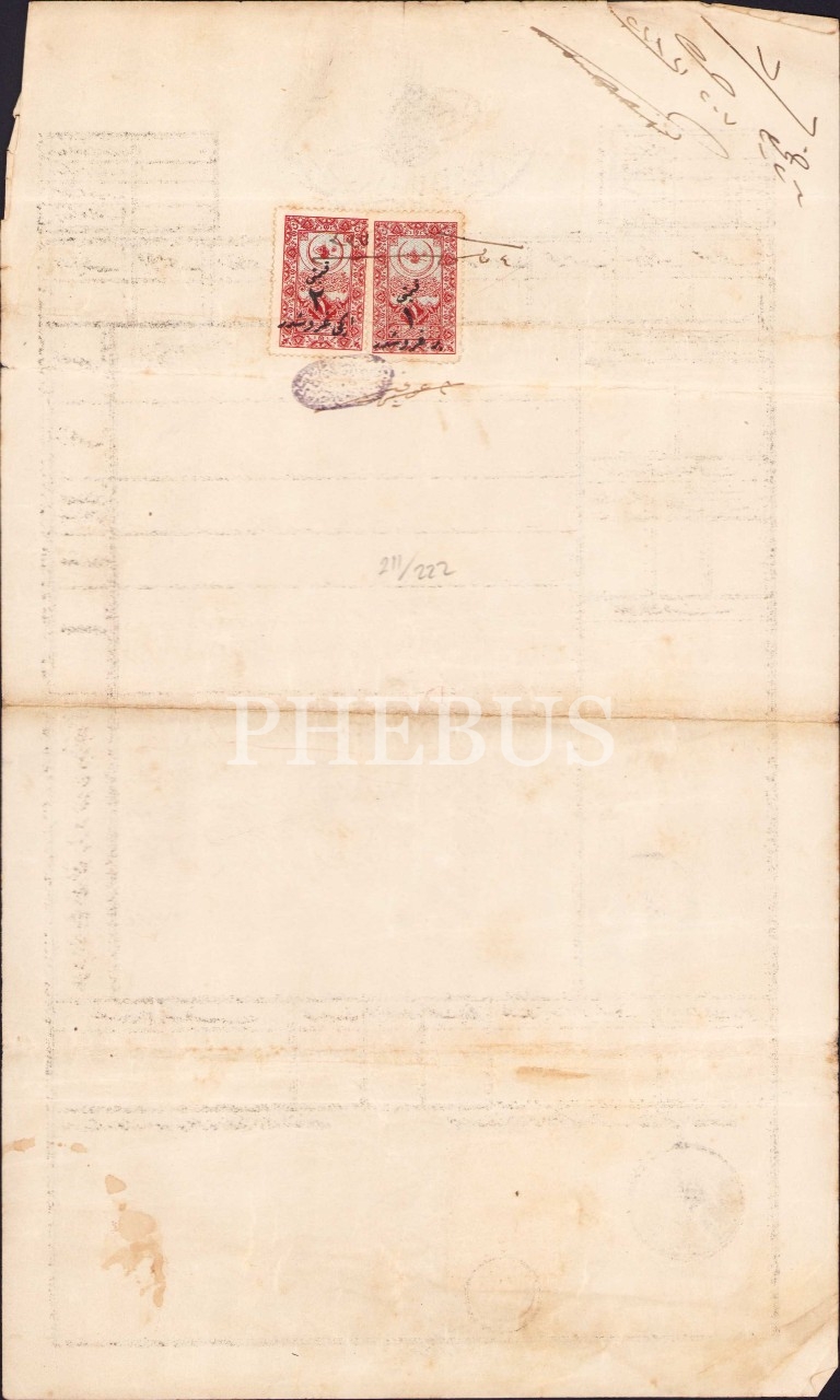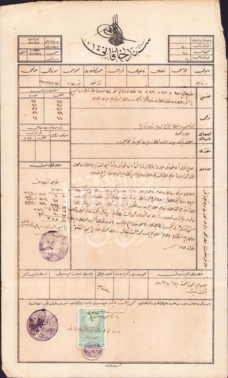 Osmanlıca Sened-i Hâkânî antetli arsa tapusu, Cerrah Mehmed Paşa vakfından, İstanbul 1337, 21x34 cm, kenarları yıpranmış haliyle