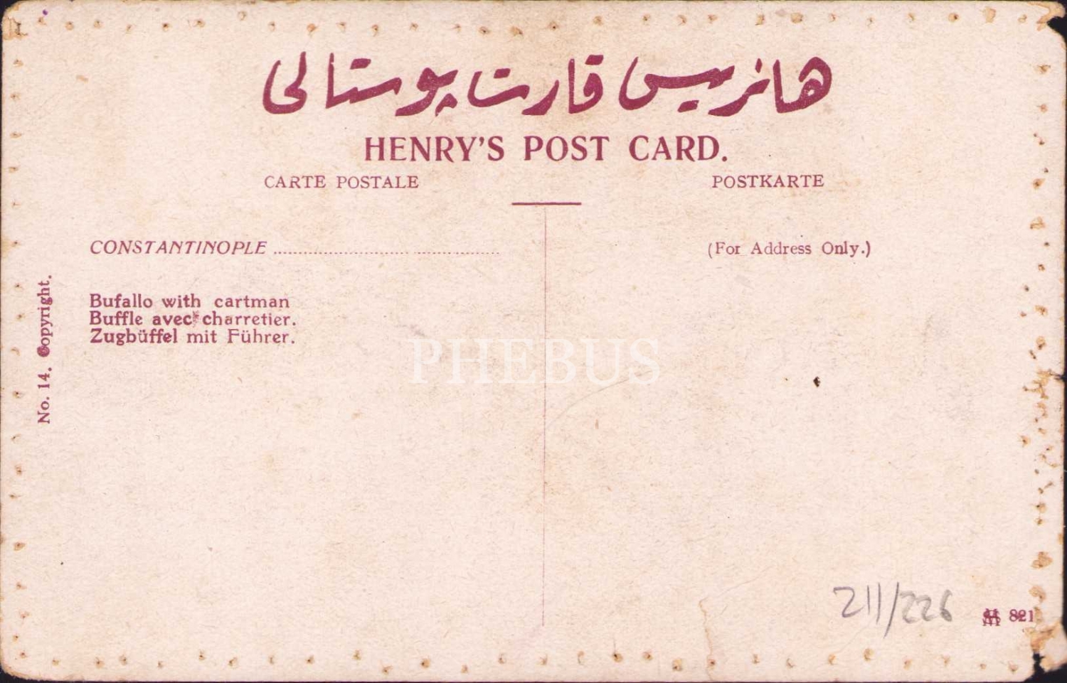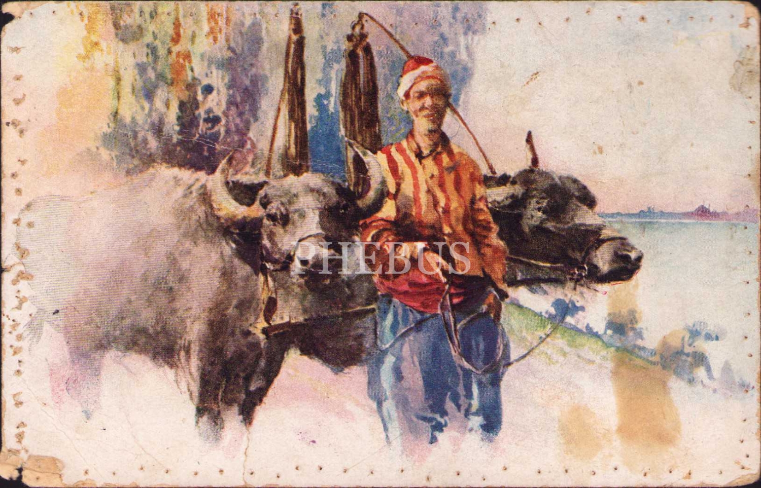 Öküz arabası ve arabacı meslek kartpostalı, Constantinople, epey yıpranmış haliyle