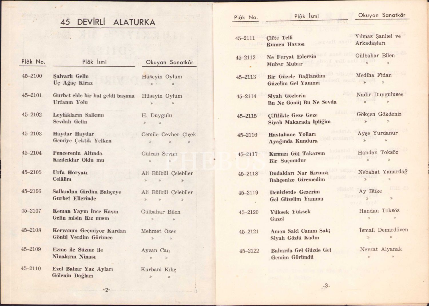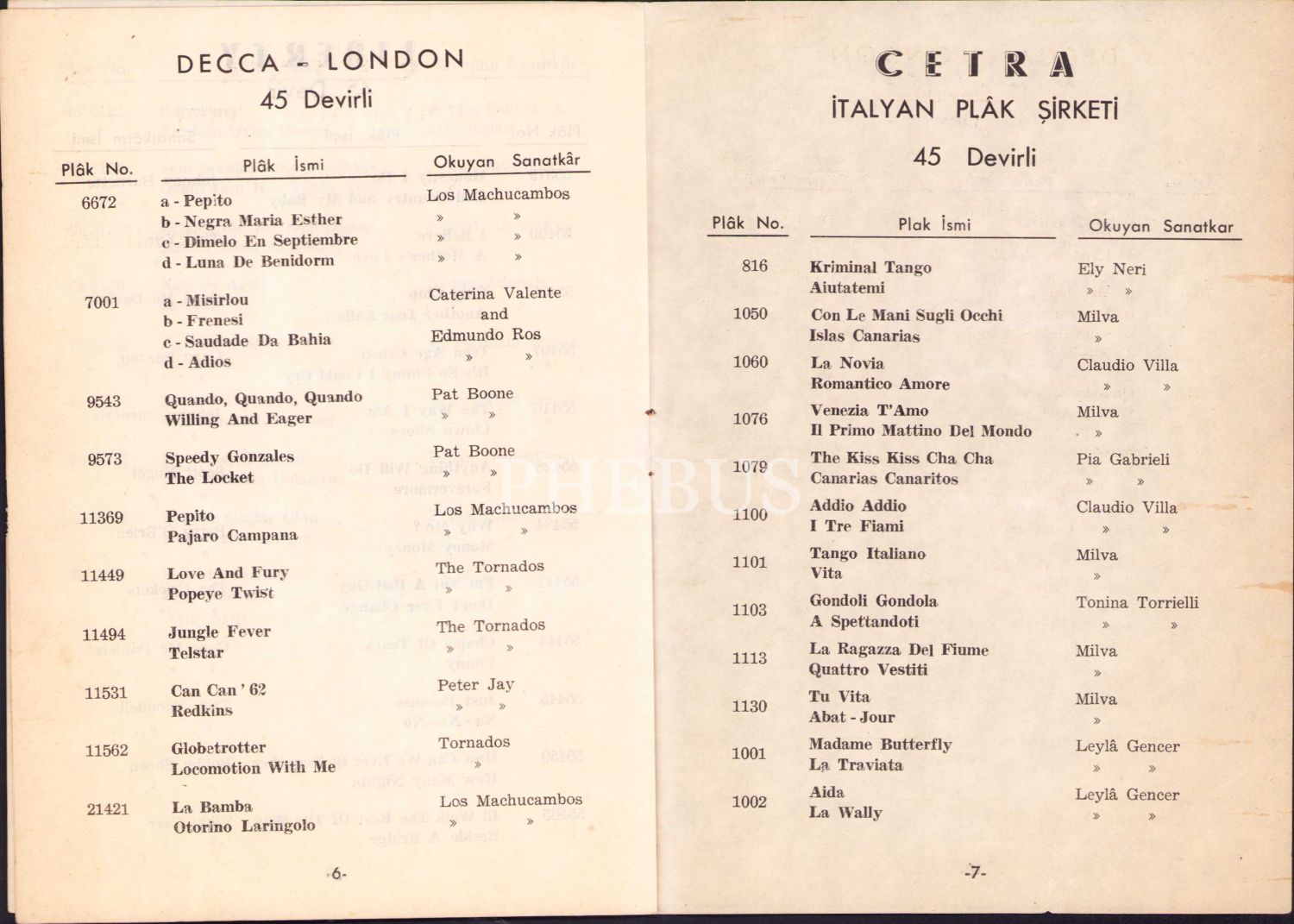 Katalog içerisinde yer alan plaklar listesi: 45 Devirli Alaturka, Liberty 45 Devir, Decca-London 45 Devirli, Cetra İtalyan Plâk Şirketi 45 Devirli, Dolton 45 Devirli