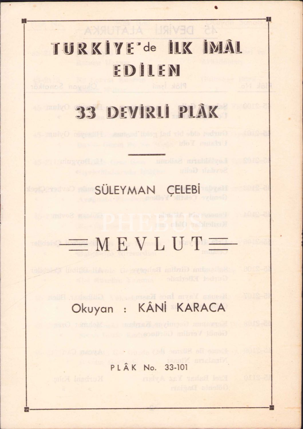 "Türkiye'de İlk İmâl Edilen 33 Devirli Plâk - Süleyman Çelebi- Mevlut, Okuyan: Kâni Karaca" duyuru kâğıdı ve çeşitli plak şirketlerine ait 45 devirli plak kataloğu, 8 sayfa, 14x20 cm