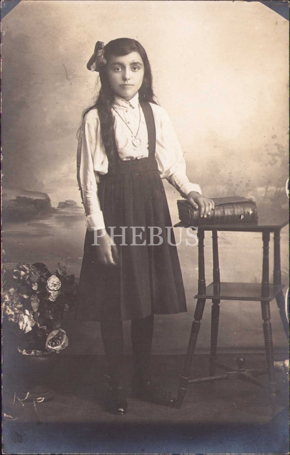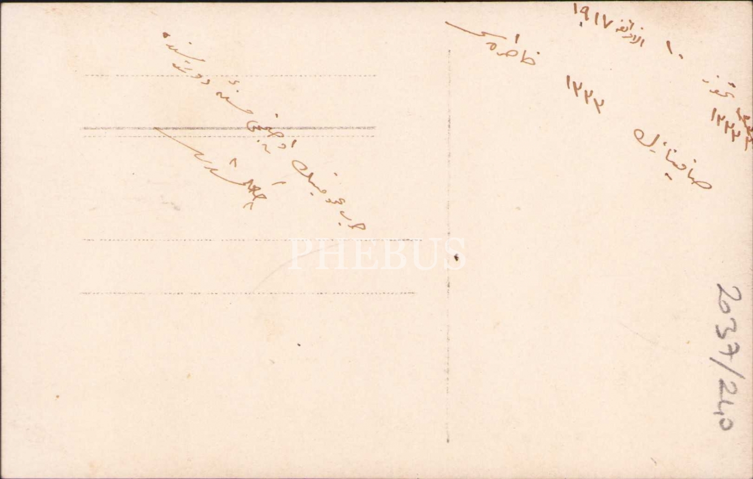 Kitabıyla poz veren kız çocuğu hatıra fotoğrafı, "Harb-i Umumi'nin üçüncü sene-i devriyesinde çekilmişdir", arkası Osmanlıca yazılı, 1917