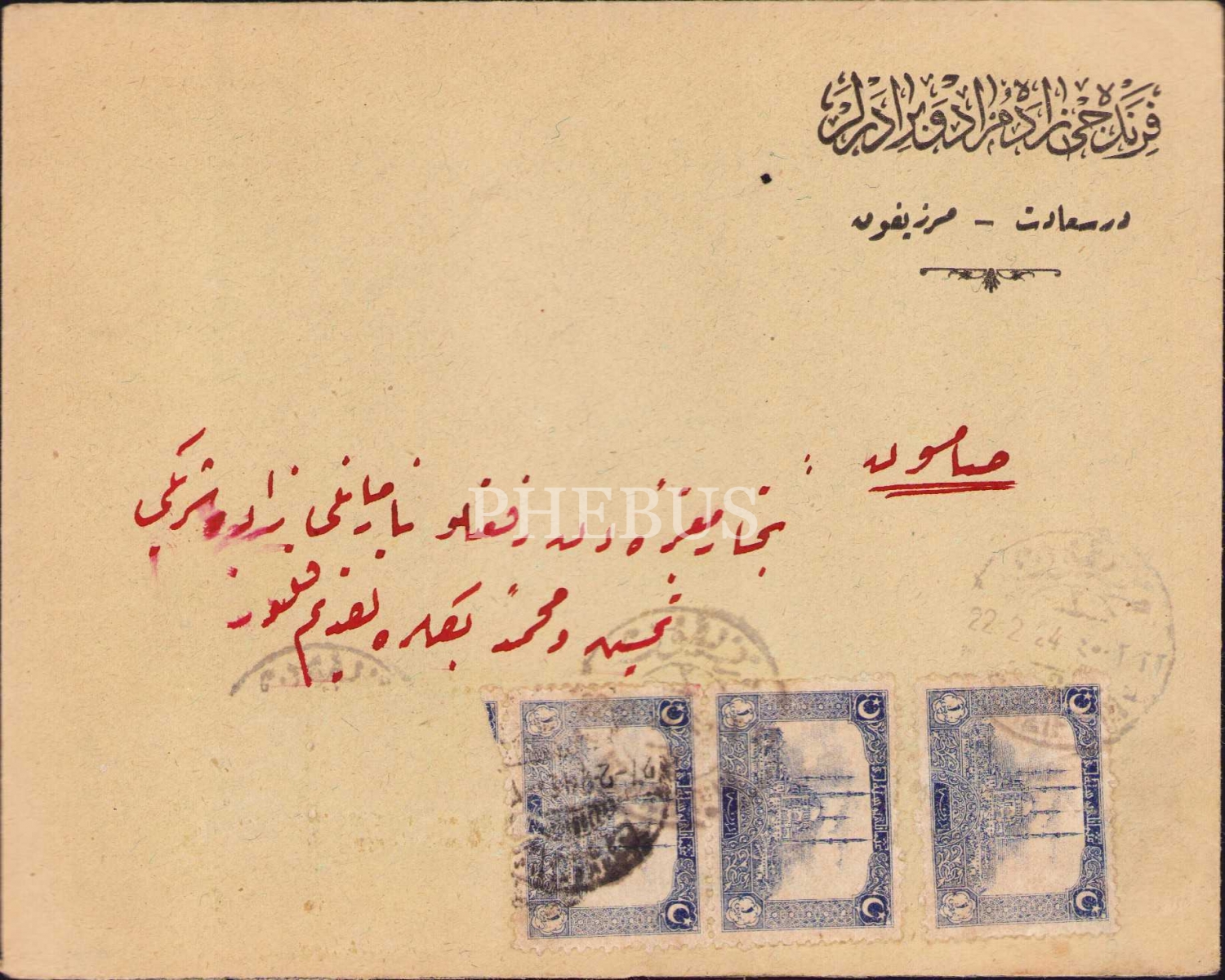 Firandecizâde(?) Murad ve Biraderler Dersaadet-Merzifon antetli, Narmanlızade Ortağı Tahsin ve Mehmed Beylere gönderilen zarf, 12x15 cm