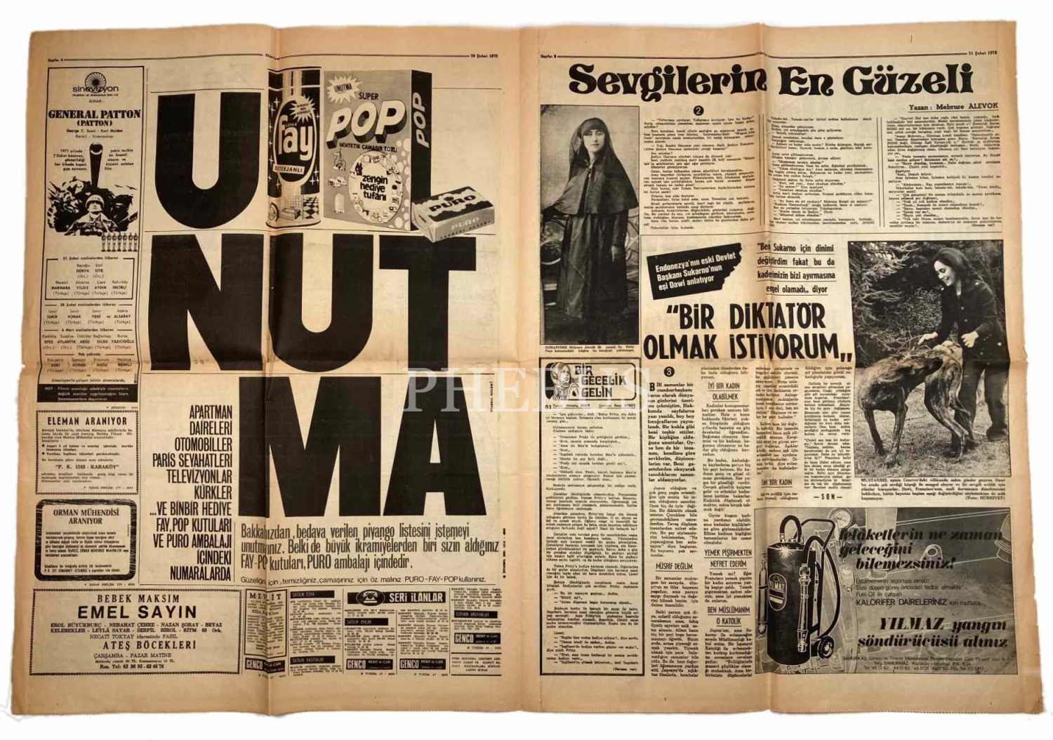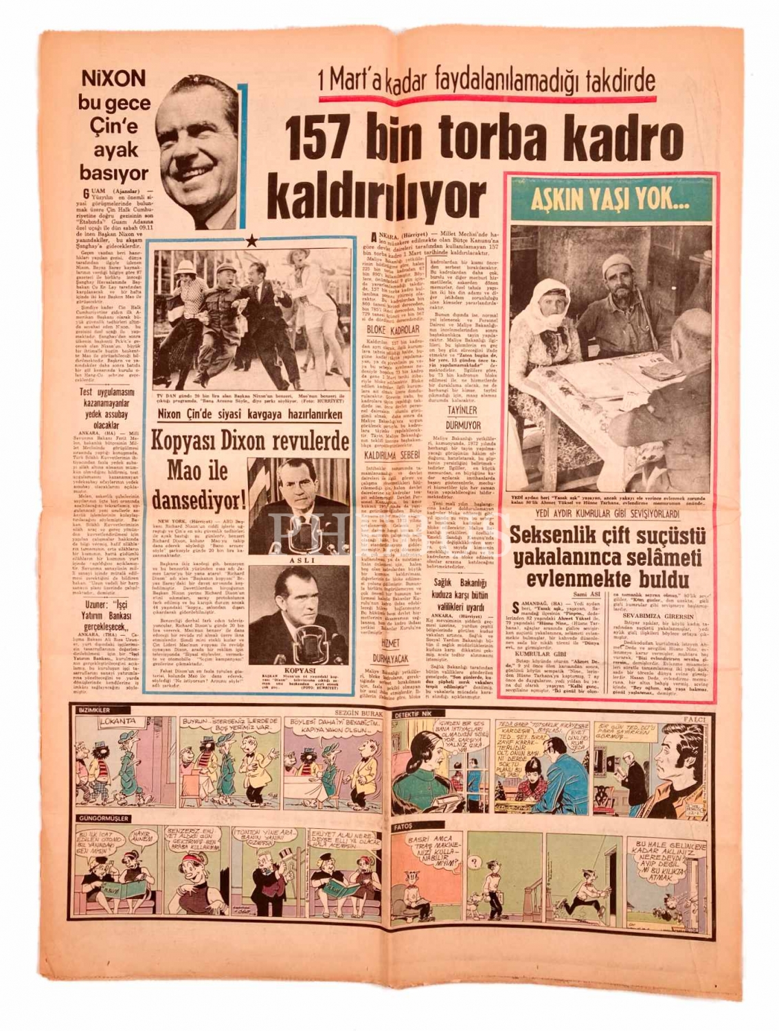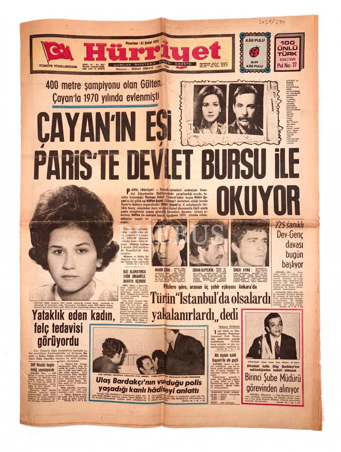 21 Şubat 1972 tarihli Hürriyet gazetesi, askerî hapishane kaçağı olan Mahir Çayan'ın evliliğine dair manşet haberiyle, 42x58 cm, yıpranmış haliyle