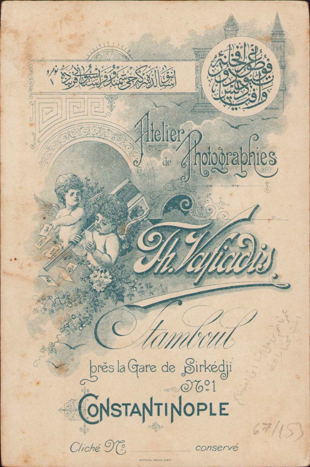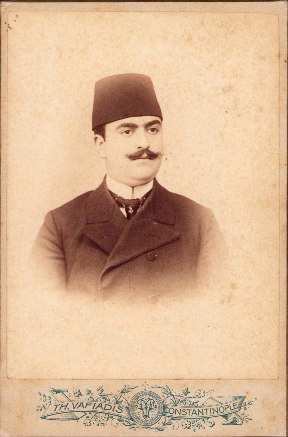 Osmanlı TH. Vafiadis Fotoğrafhanesine ait Fesli beyefendi, kabin foto, Constantinople, arkası Osmanlıca ithaflı, 11x17cm