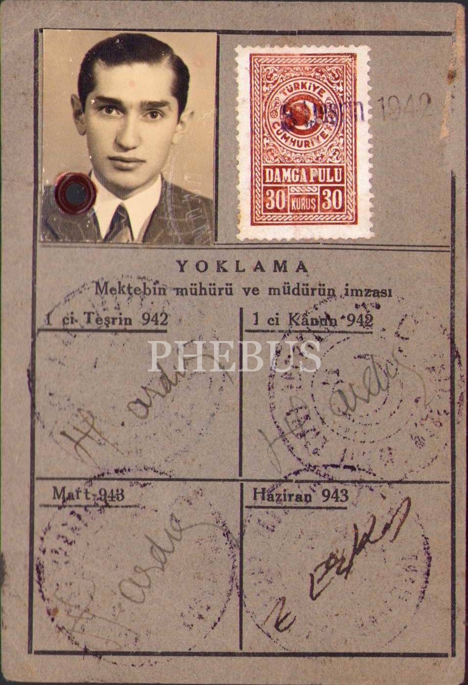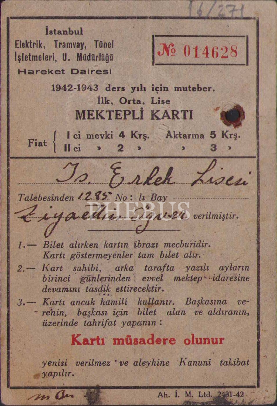 İstanbul Elektrik, Tramway, Tünel İşletmeleri U. Müdürlüğü fotoğraflı mektepli [öğrenci] kartı, 1943 tarihli, 8x12 cm