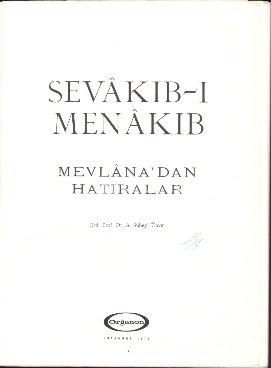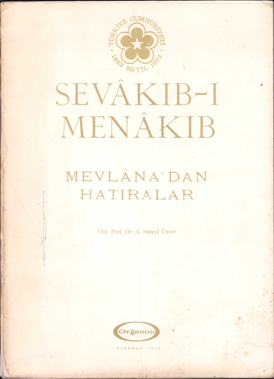 Sevâkıb-ı Menâkıb - Mevlâna'dan Hatıralar, A. Süheyl Ünver, Organon, İstanbul 1973, 52 s., 20x27 cm, kapağı yıpranmış haliyle