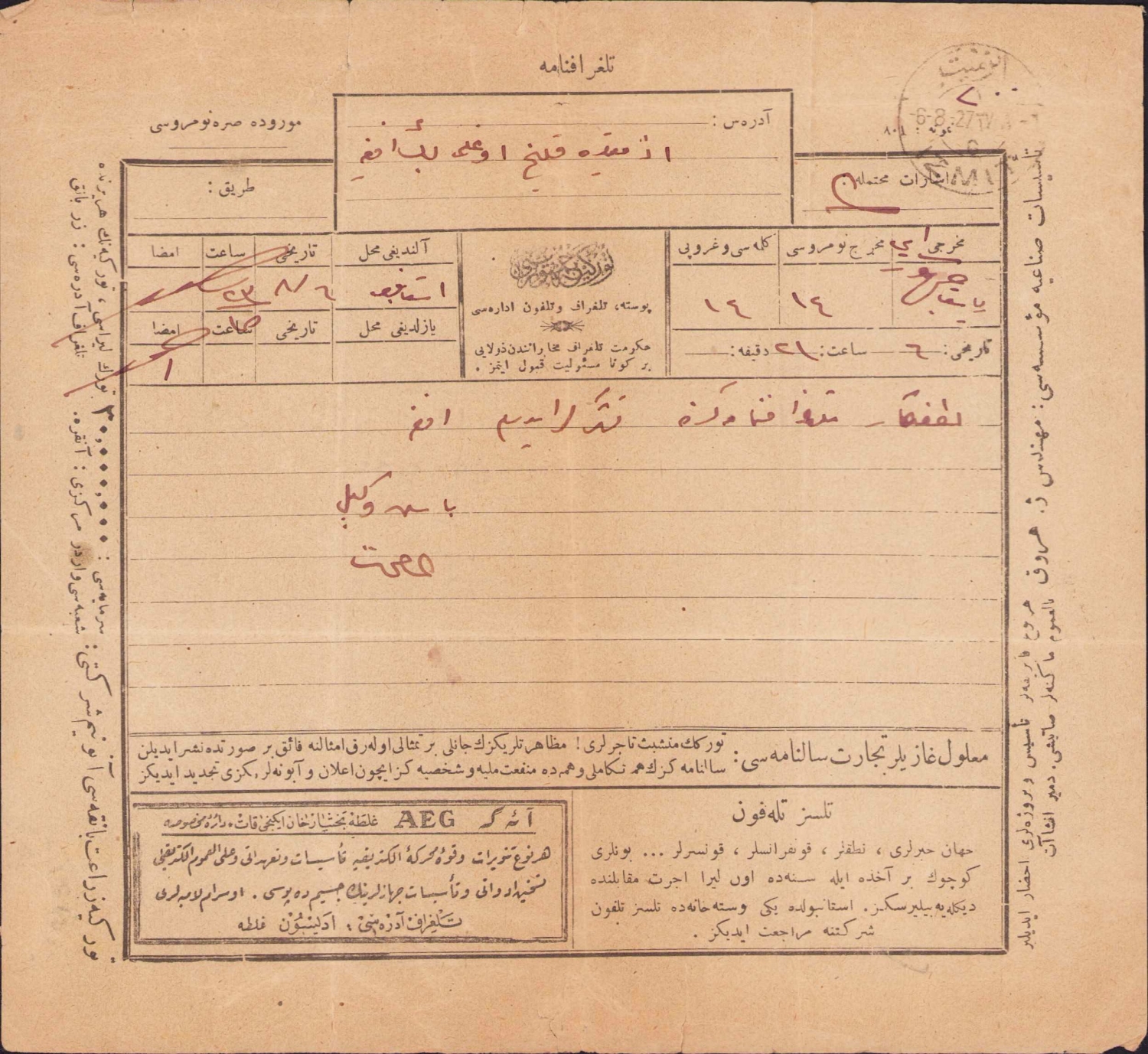 Osmanlı Başvekil İsmet Paşa'nın İzmitteki Kılıçoğlu Hakkı Beye yazdığı teşekkür telgrafı