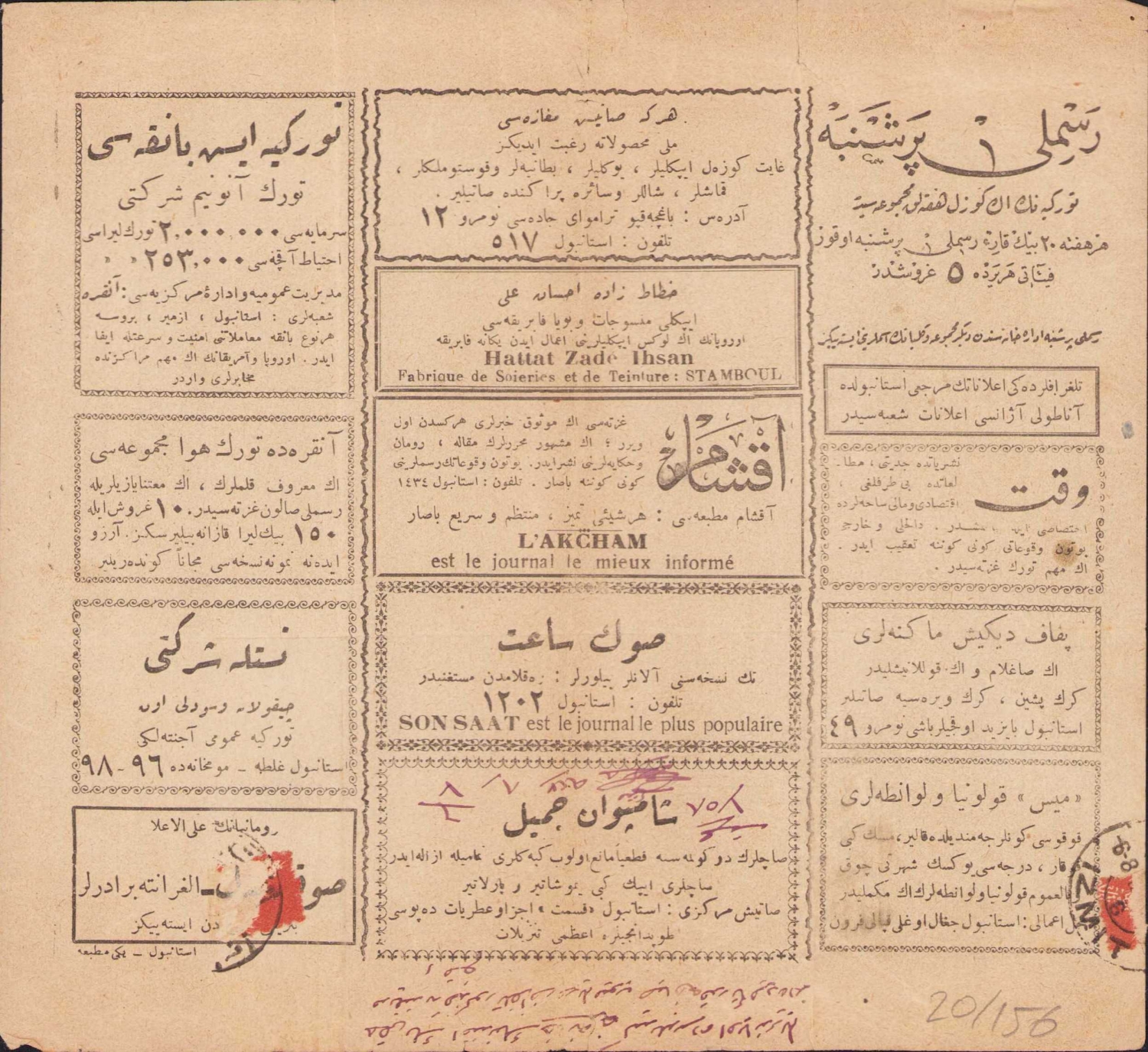 Arkası Osmanlı gazetelerine ait reklam detaylı (Resimli Perşembe, Vakit, Akşam, Son Saat), 21x20cm