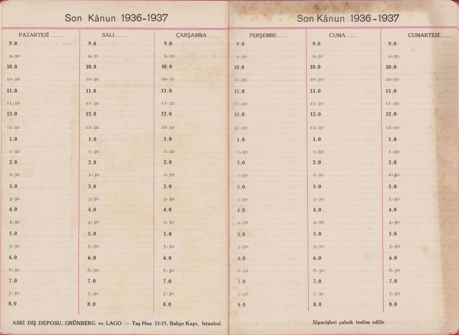 Asri Diş Deposu 1936-1937 yılı ajandası, bol dişcilik konulu reklamlı, içi yazılı, 17x25cm