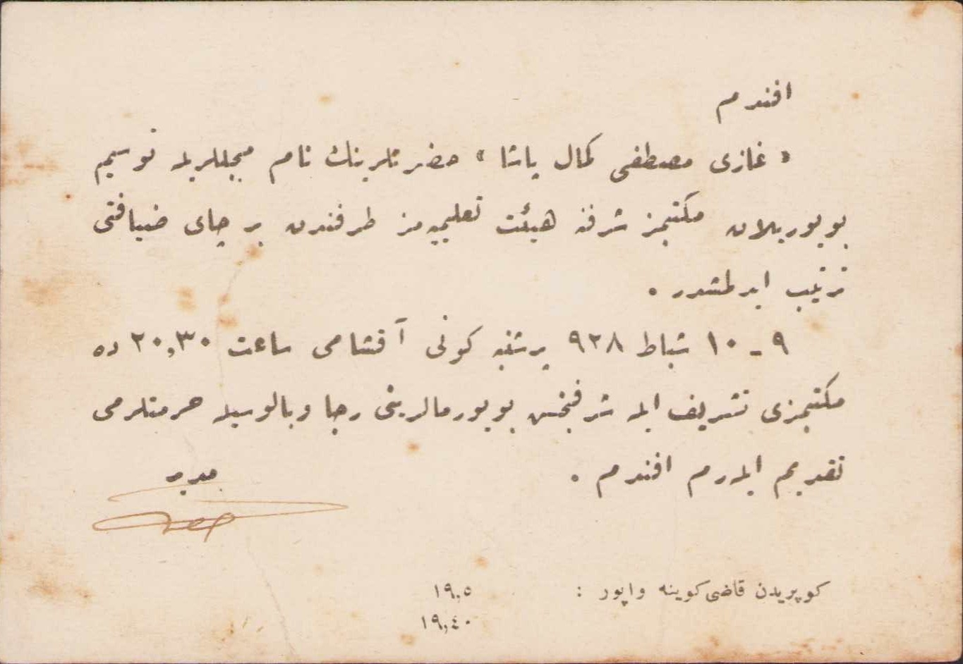 Osmanlıca Kadıköy Yeldeğirmeni'nde 1927 'de açılan Gazi Mustafa Paşa Mektebi çay davetiyesi, 9 - 10 Şubat 1928