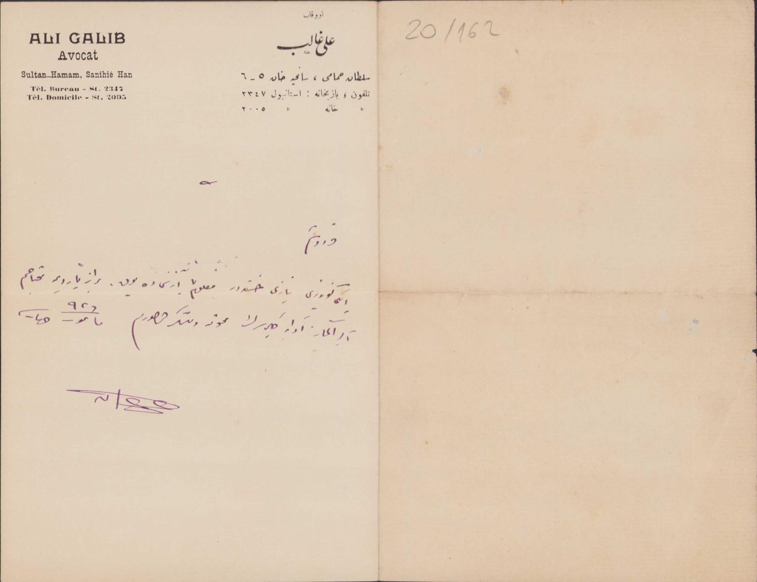 Osmanlıca - Fransızca Avukat Ali Galip antetli iş yeri dokümanı, 1926 tarihli, 26x20cm