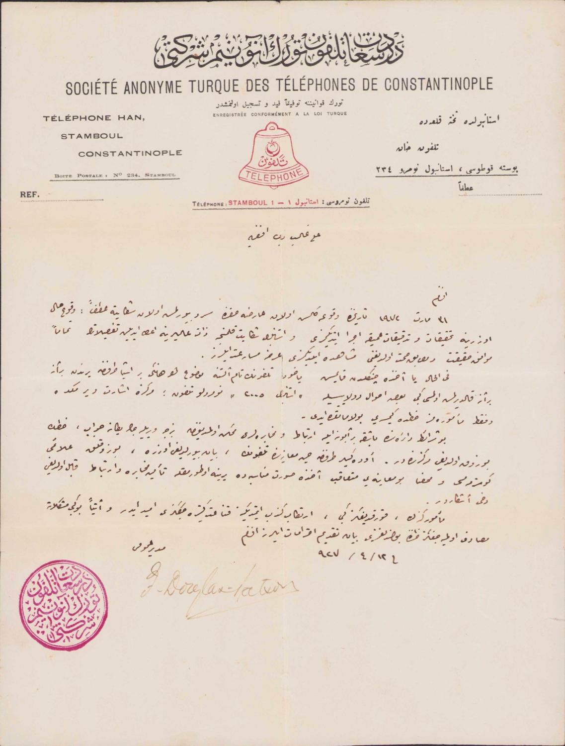 Osmanlıca - Fransızca Dersaadet Telefon Türk Anonim Şirketi antetli işyeri dokümanı, şikayet kalemine bildiri, 1927 tarihli, müdiri umumi imzalı, damgalı, 22x28cm
