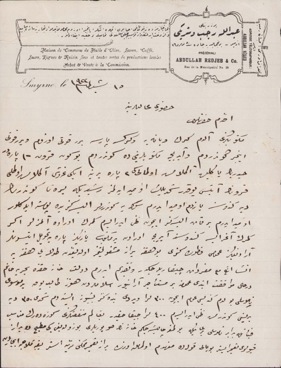 Osmanlıca - Fransızca Prezerinli Abdullah Recep ve Şirketi antetli işyeri dokümanı, İzmir, 1922 tarihli, 21x27cm