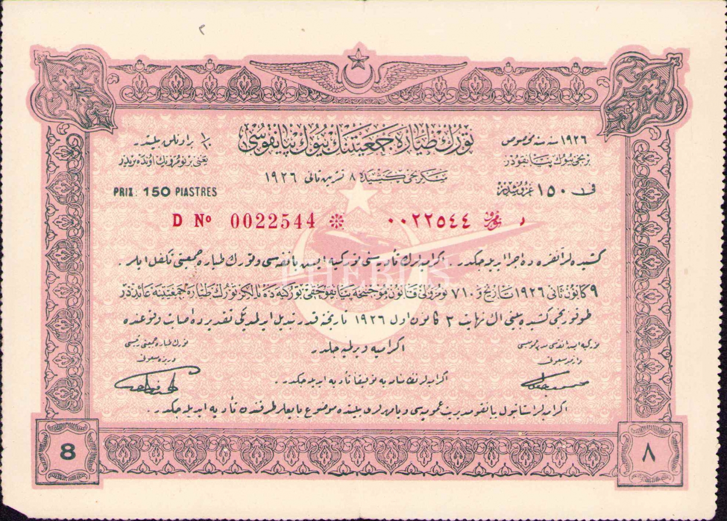 Osmanlıca Türk Tayyare Cemiyeti Büyük Piyangosu, 8 Teşrinisani 1926, 1/10 Bilet, D